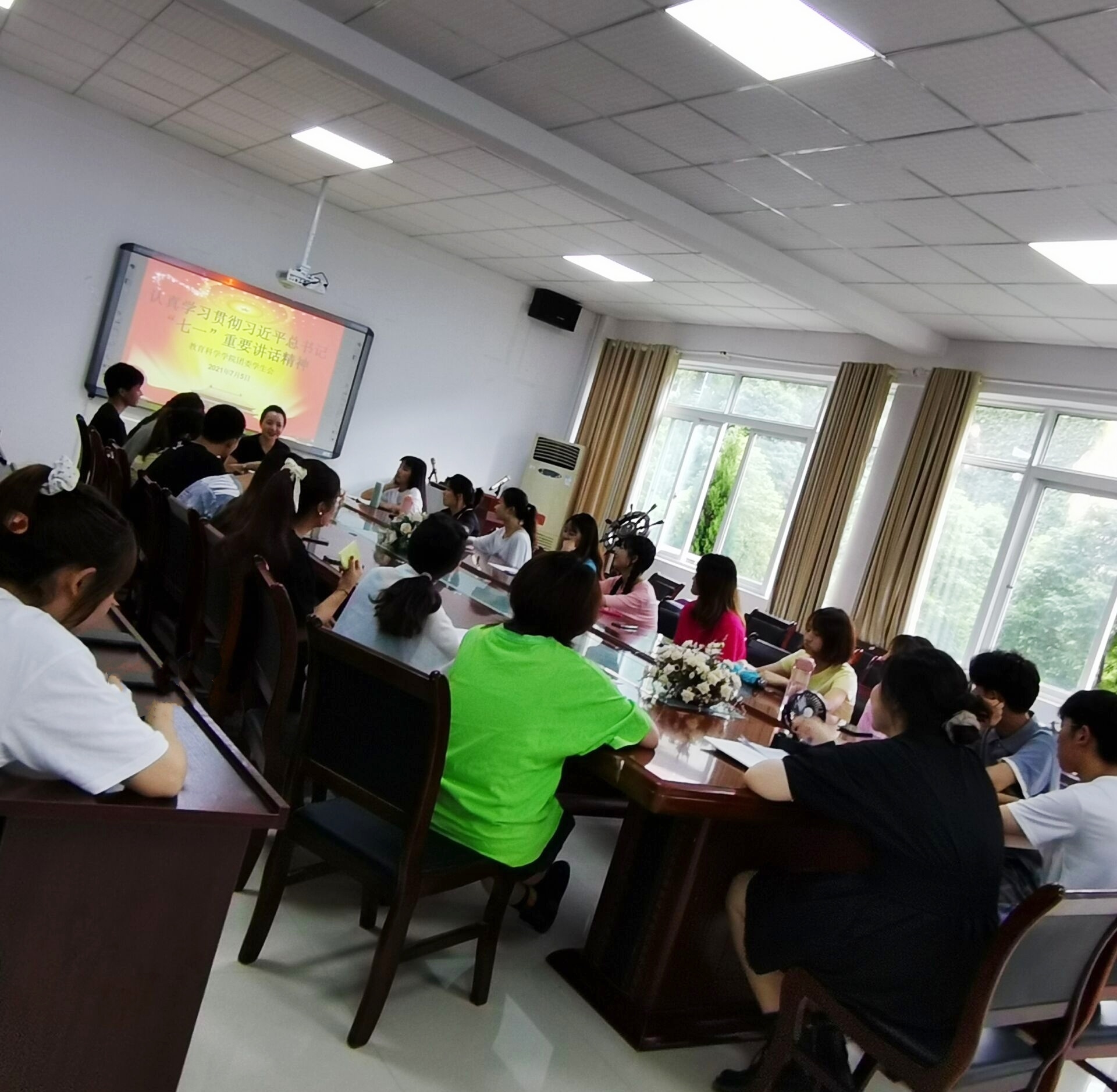 7月1日庆祝中国共产党成立100周年大会在北京天安门广场隆重举行。中共中央总书记、国家主席、中央军委主席习近平发表重要讲话。教育科学学院组织党员干部师生集体收听收看大会盛况,通过多种形式学习热议习近平总书记重要讲话精神,掀起学习宣传贯彻热潮。7月5日,教育科学学院团委书记张源老师带领团委学生会全体成员在会议室召开会议,深入学习习近平总书记7月1日在庆祝中国共产党成立100周年大会上的重要讲话精神。