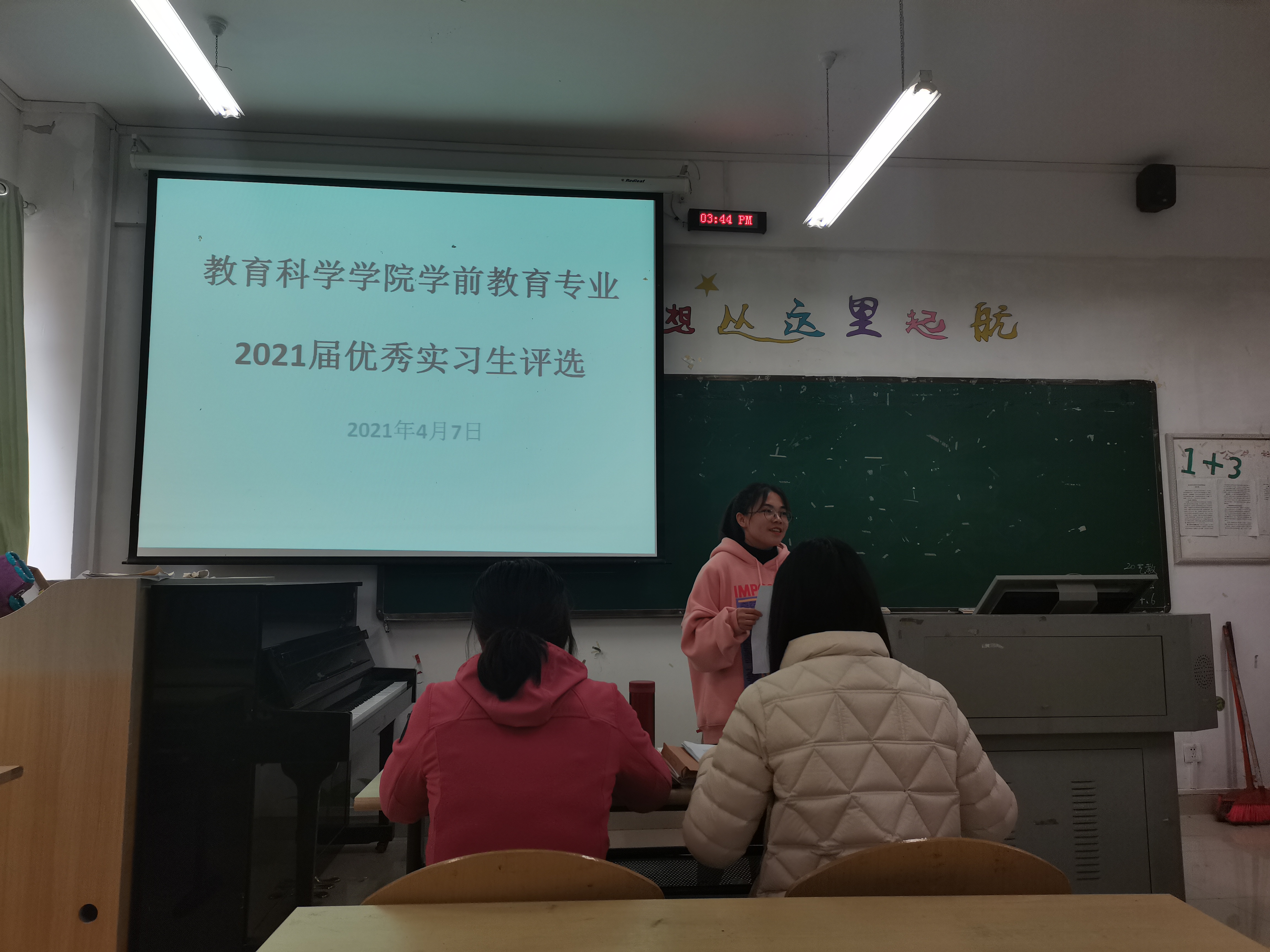 2021年4月7日14:00,教育科学学院学前教育专业在逸夫楼514举行了2021届优秀实习生评选活动,此次活动的评委是学前教育系老师冯静、罗婷,学前教育专业2017级实习生参与此次评选,学前教育专业2018级全体同学到场观摩与学习。