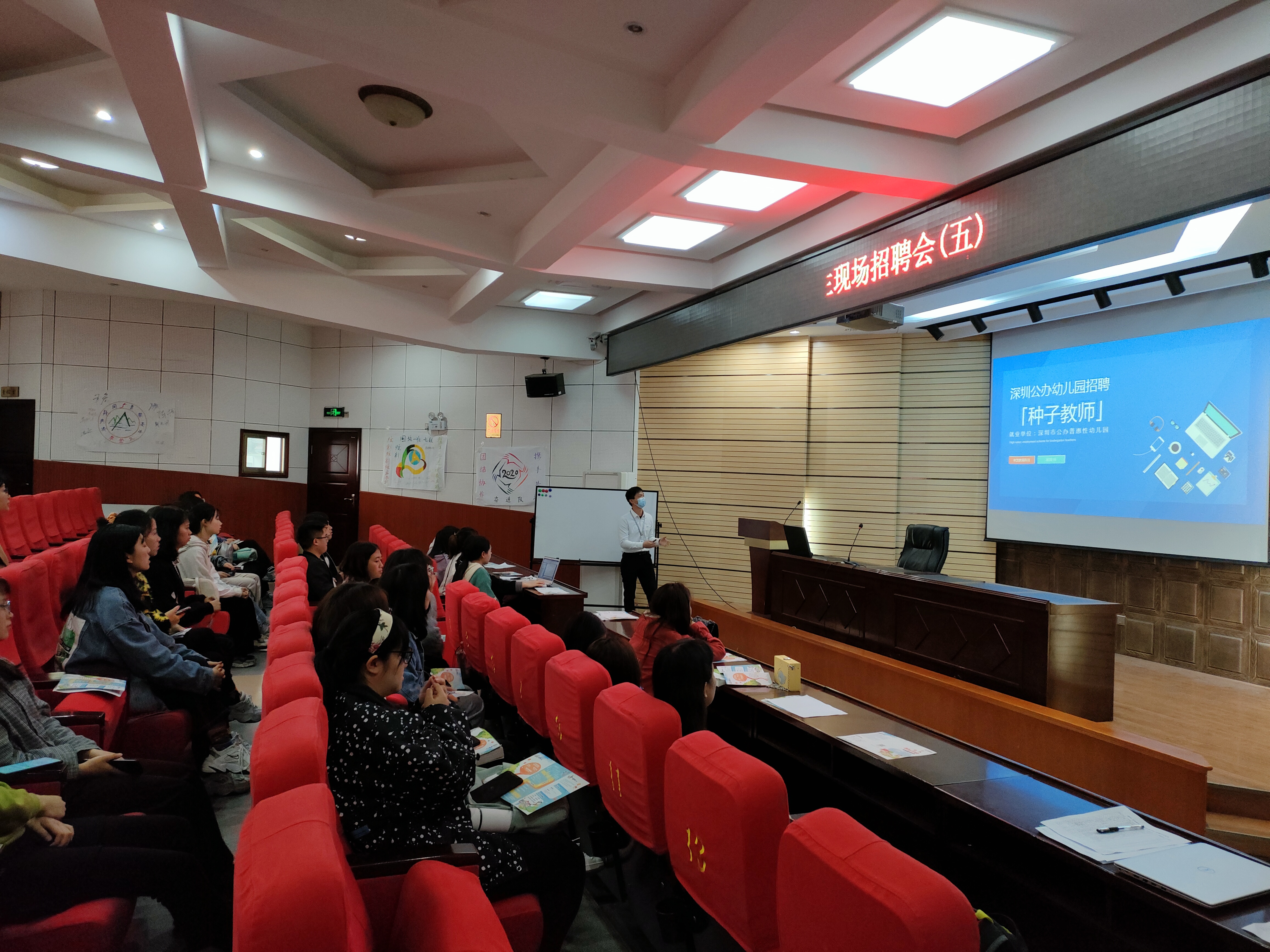 招聘会上,深京发教育科技有限公司的江浩瀚老师详细地介绍了京发教育公司的创办情况和深圳市民办幼儿园向公办幼儿园转型的趋势,说明了此次招聘的目的、招聘的岗位、招聘的要求、工资的待遇和报名流程等,最后,江浩瀚老师耐心地解答了同学们提出的疑问,并动员同学们积极应聘,做好人生规划,在工作中不断丰富自己、发展自己和完善自己。