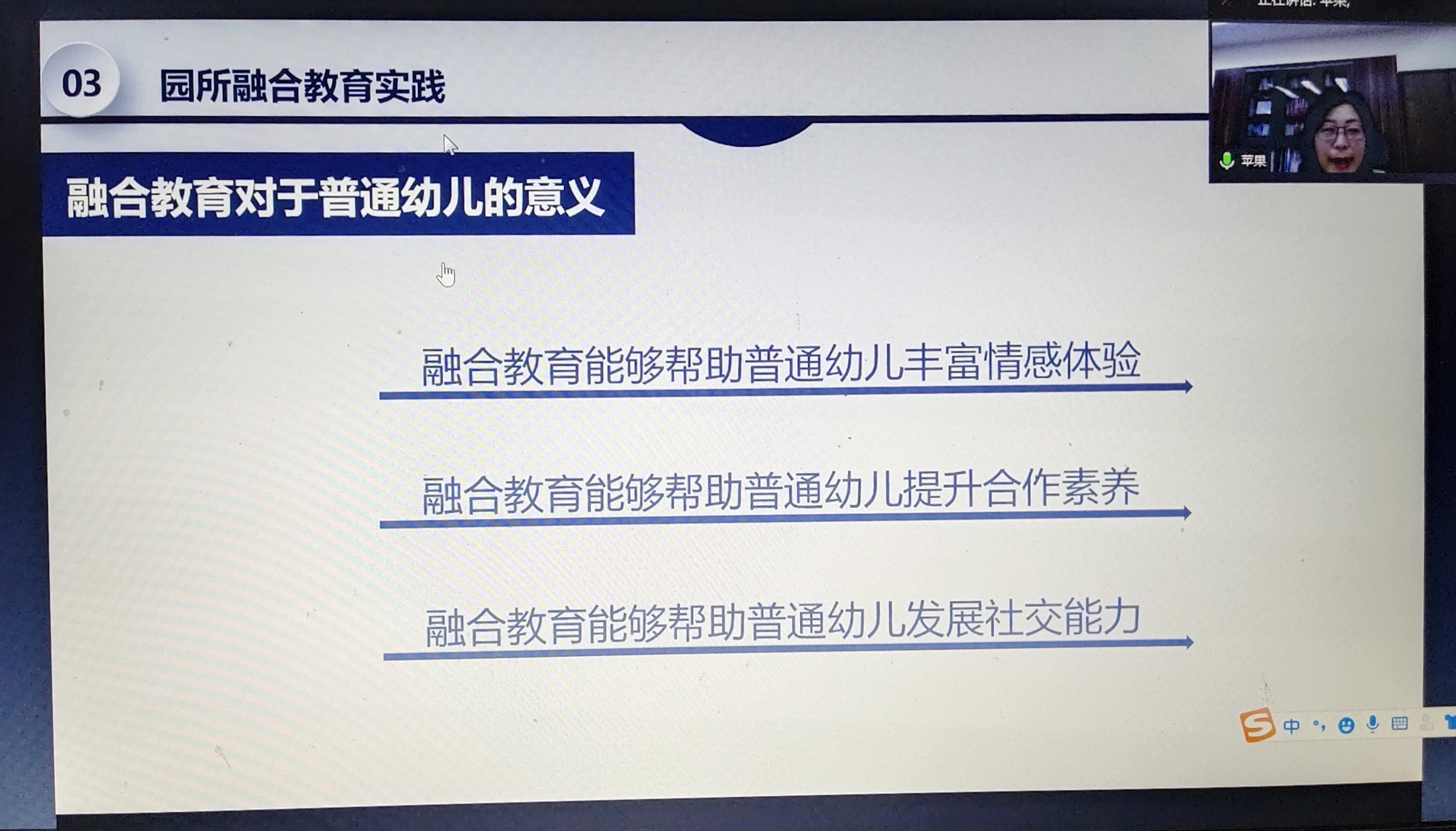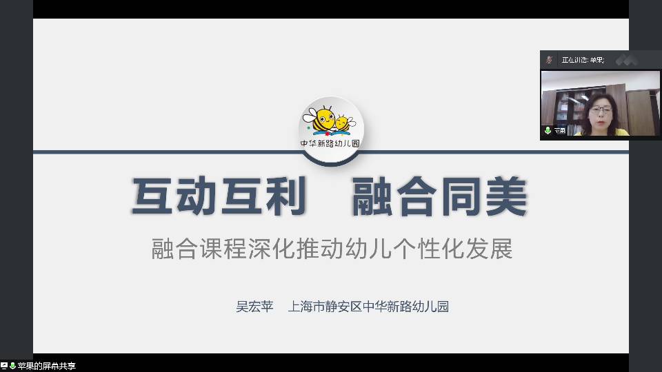 5月12日下午,为加强特殊教育专业学生的实践学习经验,帮助学生更好了解特殊教育在一线的融合教学情况,教育科学学院特殊教育系邀请上海市静安区中华新路幼儿园吴宏苹园长通过腾讯会议远程进行讲座,参与此次讲座的有特殊教育系专业教师、2018-19级特殊教育系全体学生。
