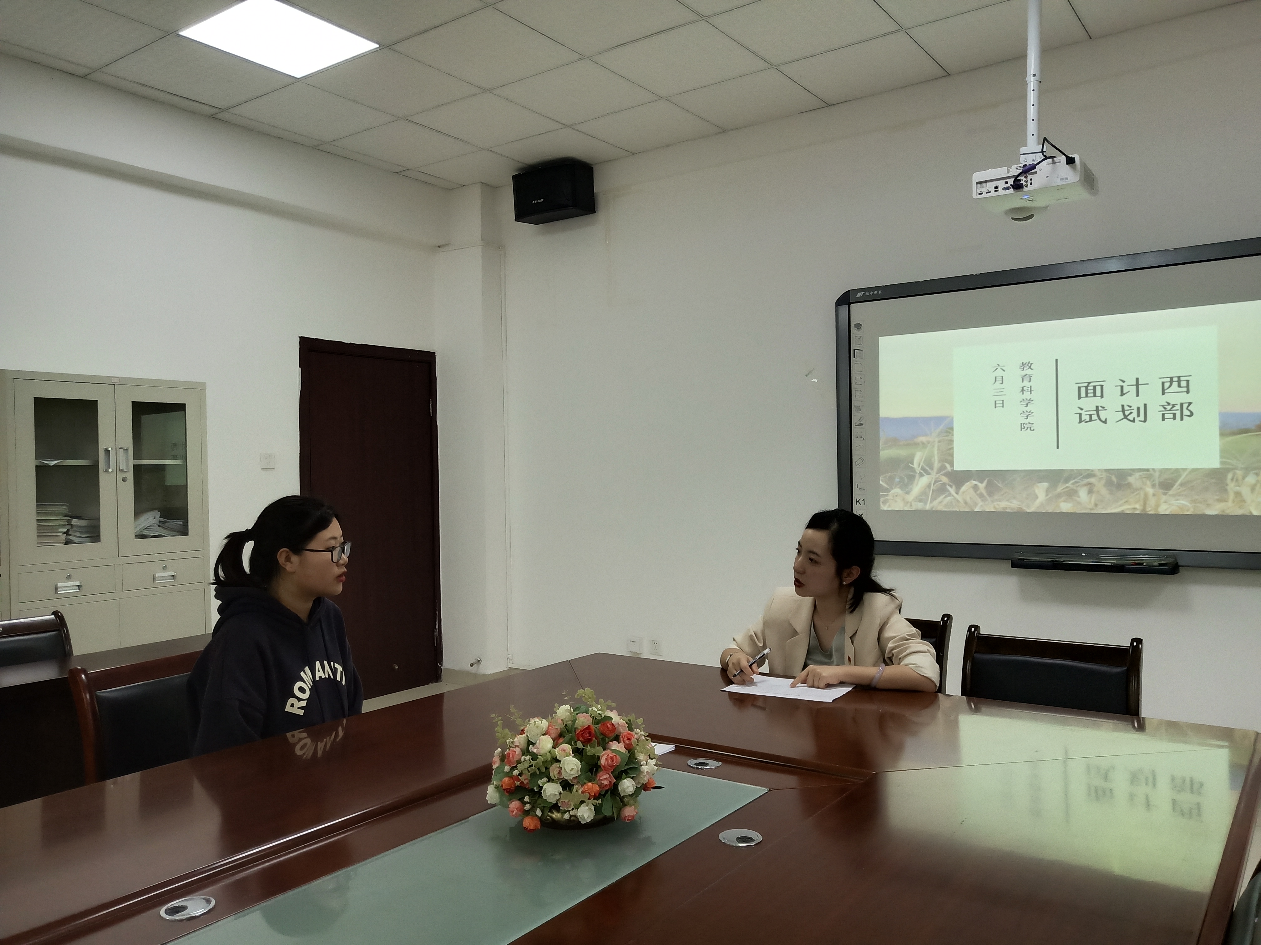 为做好2021年西部计划志愿者的招募工作,鼓励2021届毕业生积极参与西部计划、投身西部基层中去。教育科学学院于6月3日下午四点在逸夫楼会议室举行了西部计划志愿者面试选拔活动,学院团委书记张源老师担任此次面试的评委,共8名有意向的毕业生参加了面试。