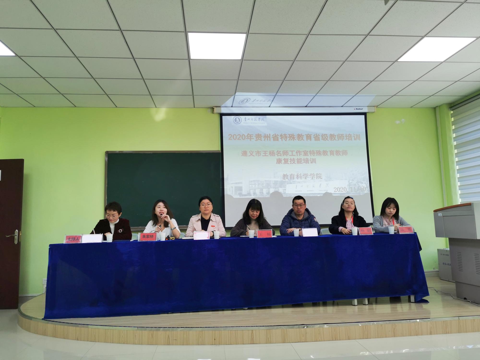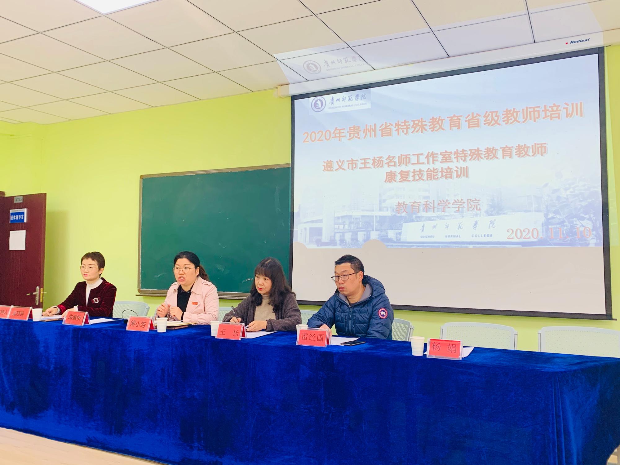 20201110日上午,2020年贵州省特殊教育省级教师培训暨遵义市王杨名师工作室特殊教育教师康复技能培训的开班典礼在贵州师范学院逸夫楼A215教室举行。开班典礼由教育科学学院吴晓英博士主持,教育科学学院党委副书记傅小芳、贵州省特殊教育名师工作室王杨、教育科学院特殊教育系教师代表及参加培训的18位学员老师参加。