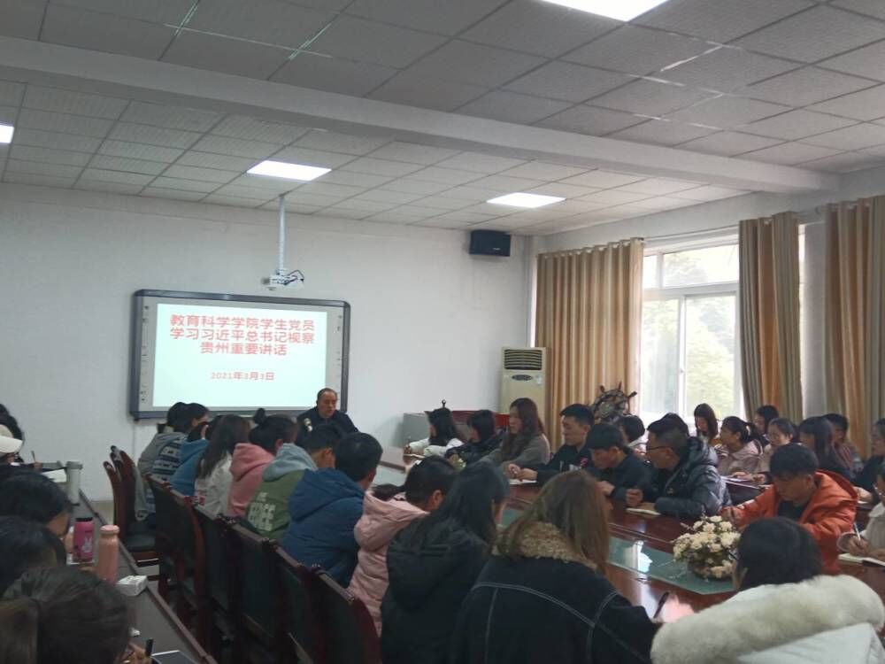 3月3日中午1:00,在逸夫楼学院会议室,教育科学学院党委书记彭祥友给全院学生党员宣讲学习习近平总书记视察贵州重要讲话精神,学生党支部副书记张玮岳主持学习会。