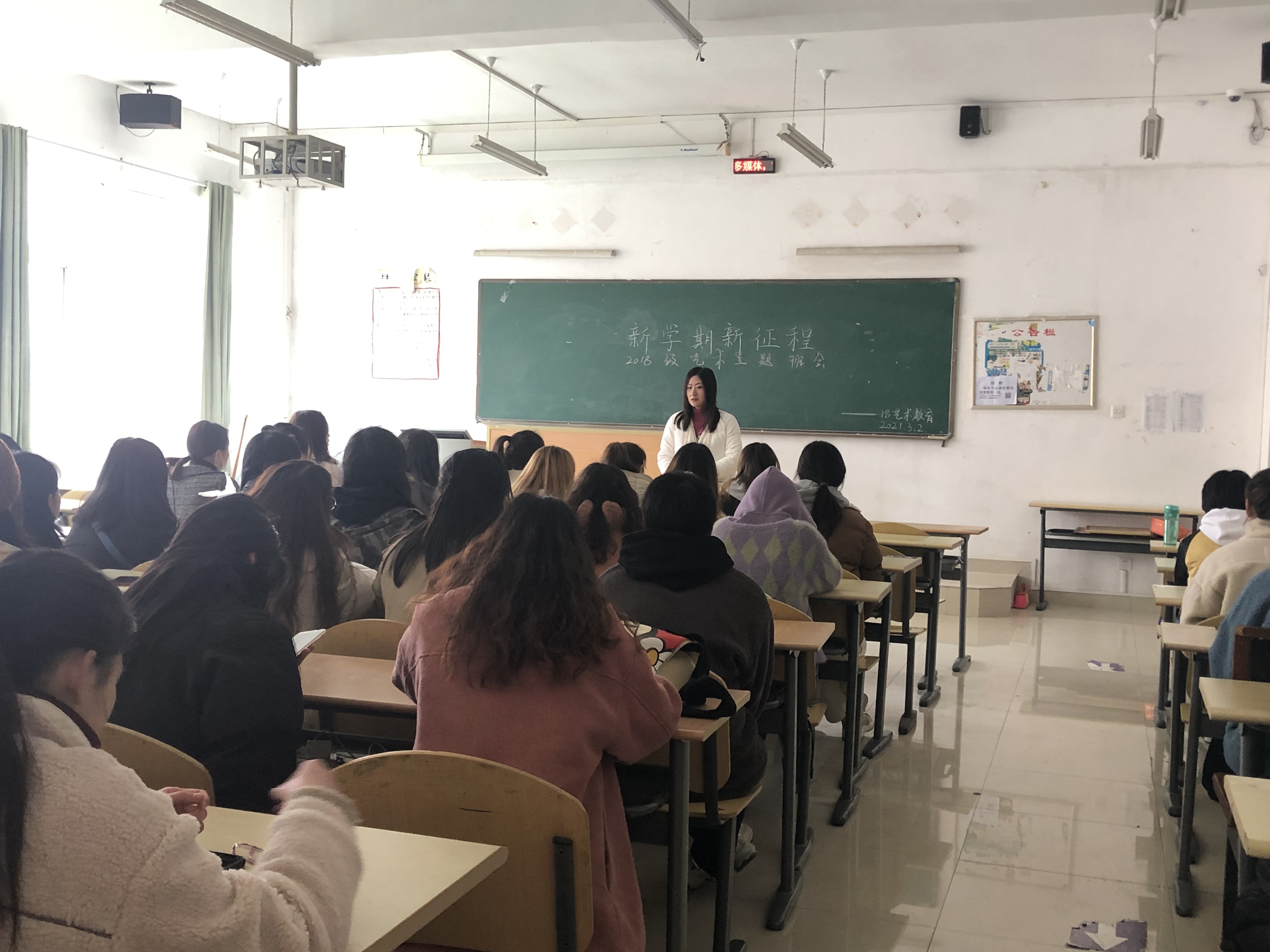 2021年3月3日中午1点,2018级艺术教育班在逸夫楼403教室召开“新学期新征程”主题班会。出席本次班会的有教育科学学院艺术教育专业系主任马慧慧、2018级艺术教育班全体学生,会议由孔小文主持。