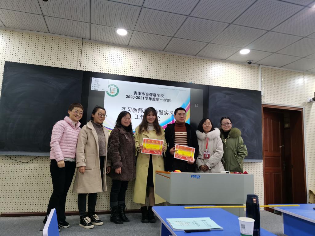 最后,郭绪英会议总结讲话。她首先祝贺五位实习师顺利完成了实习工作,其次感谢各位实习师对学校的信任和认可选择贵阳市盲聋哑学校实习;并希望各位实习教师能将实习中学到的东西应用于今后的学习和工作中,守住初心,做一个有温度的特教人。她还为本学期的优秀实习生进行颁奖,然后会议在大家愉快的合影留念中走进尾声。
