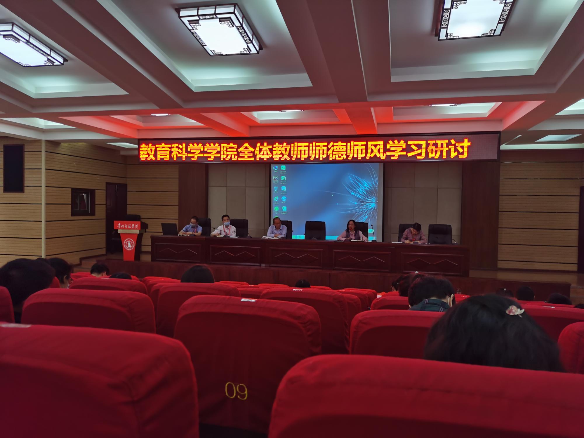 2020年5月22日下午,教育科学学院在文韬苑道德讲堂组织教师学习《贵州省高校教师师德失范行为处理办法(试行)》。院党委书记彭祥友、院长刘红、党委副书记傅小芳、副院长黎平辉、副院长袁川以及全院教职工参与了本次学习。学习由教院长刘红主持,袁川院长带领全院教职工认真学习了本办法。