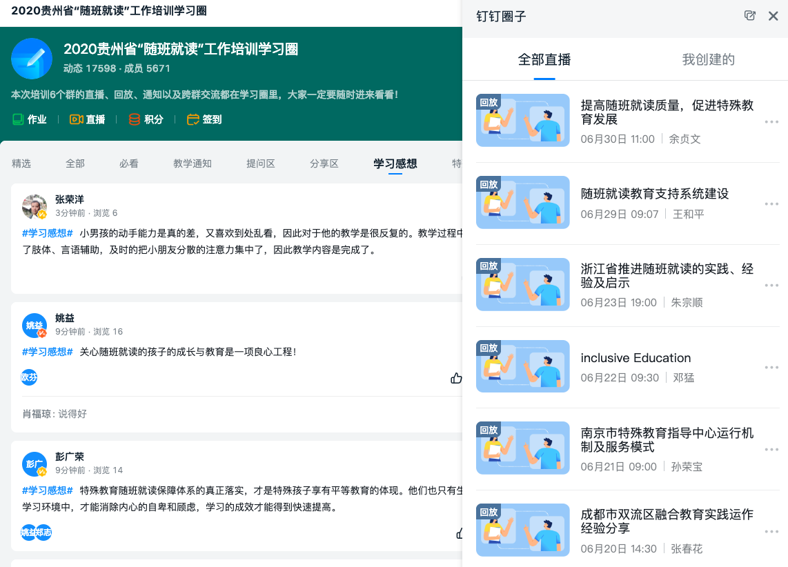 此次培训专家们分享了不同区域随班就读工作的实践、经验及问题,从政策规章、支持系统的建构、评估领域、目标差异、教学调整等多方面进行讲解。参与培训的教师获得了较为系统的随班就读知识。培训过程中,丰富多彩的课堂内容吸引了学员的注意,来自实践的案例引发了大家的共鸣和思考。授课结束后,学员们在群组学习圈里认真讨论,分享经验。