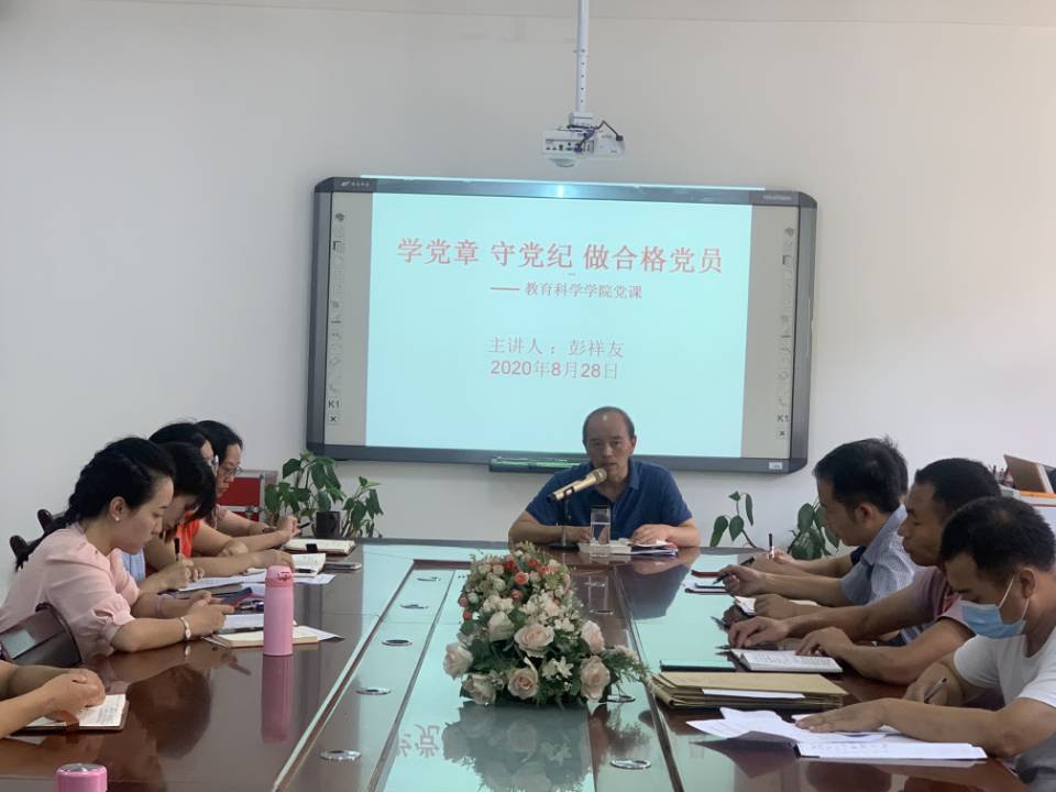 8月28日下午,教育科学学院全体教师党员在逸夫楼321会议室举行“党课开讲啦”活动,学院党委书记彭祥友以“学党章,守党纪,做合格党员”为主题给全体教师党员上党课。