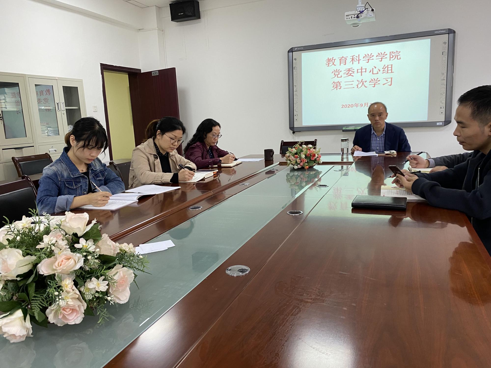 9月22日下午,教育科学学院2020年党委中心组第三次集中学习在逸夫楼321会议室进行。院党委书记彭祥友、院长刘红、副书记傅小芳、副院长黎平辉和袁川,以及团委、各党支部负责人到场参加。学习活动由彭祥友主持。