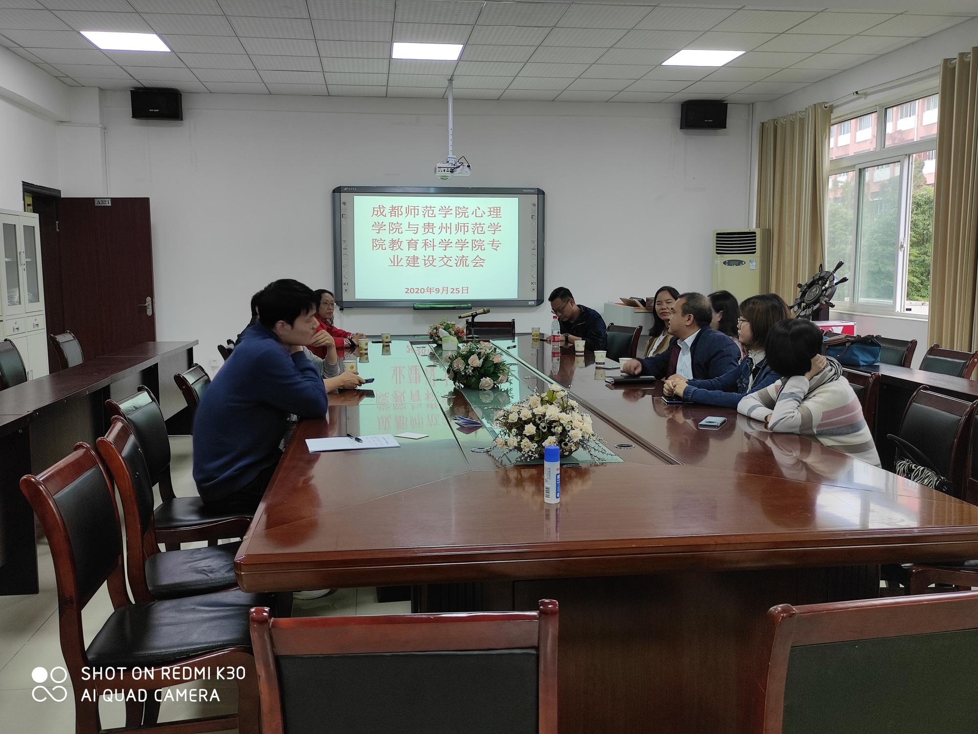 2020年9月25日下午,成都师范学院心理学院副院长胡韬一行7人与我校教育科学学院进行专业建设交流研讨会,会议由副院长黎平辉主持,院长刘红、应用心理学系主任罗凯、博士李强、副教授张金勇和唐辉一老师出席了会议。