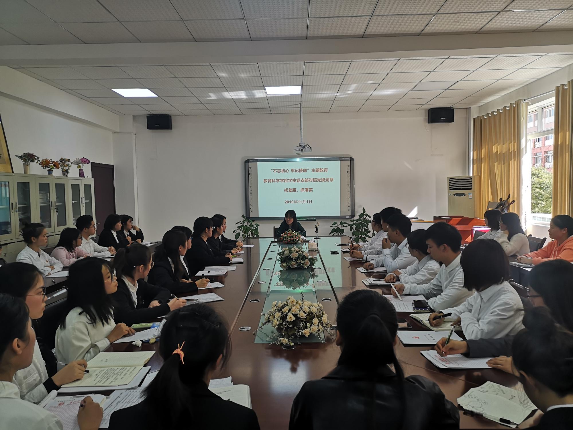 11月1日,教育科学学院学生党支部在逸夫楼321会议室集中开展“不忘初心、牢记使命”主题教育之学生党员对照党规党章找差距、抓落实活动。本次主题教育由学生党支部书记申苒主持,全体学生党员到场参加。