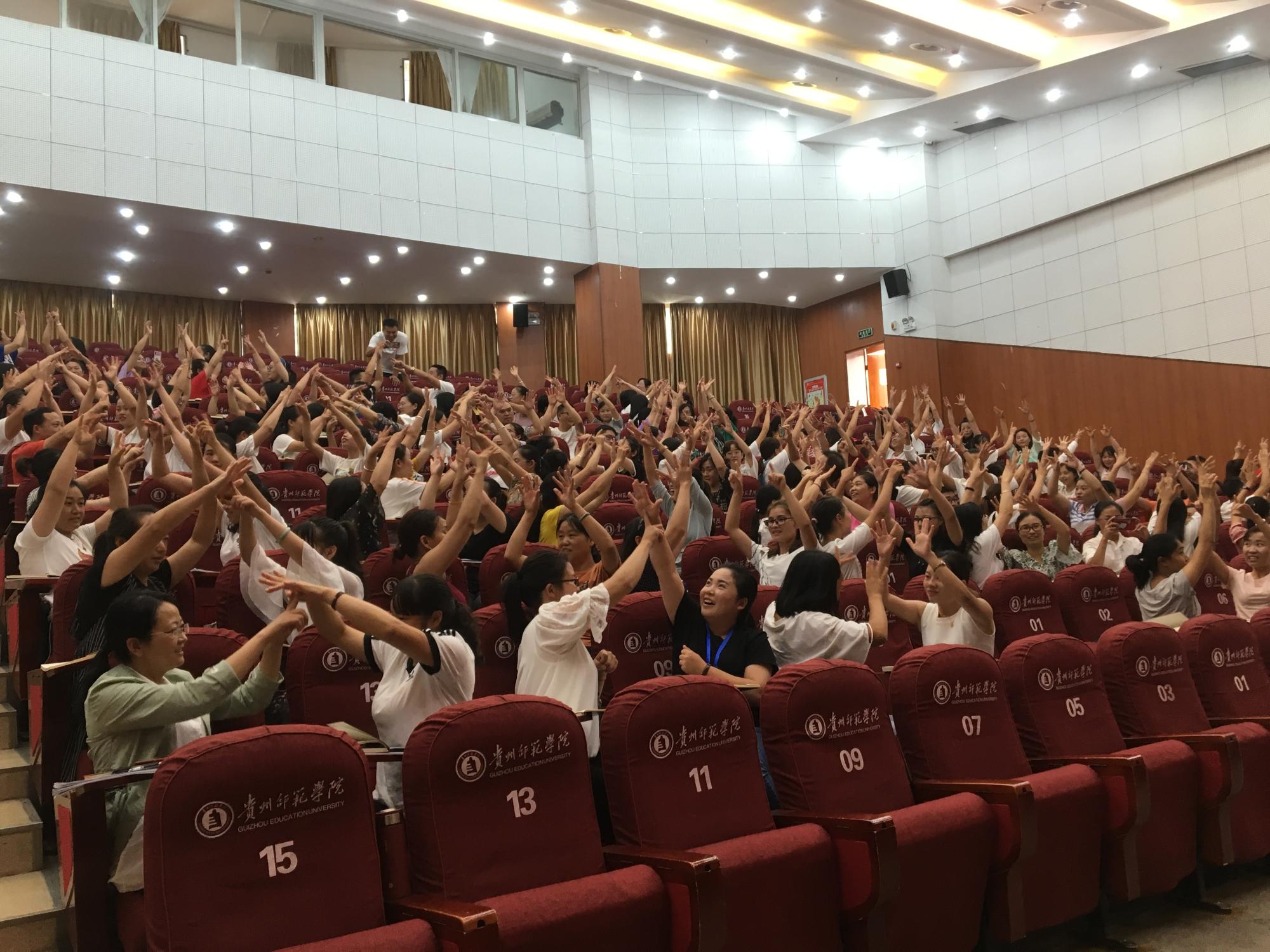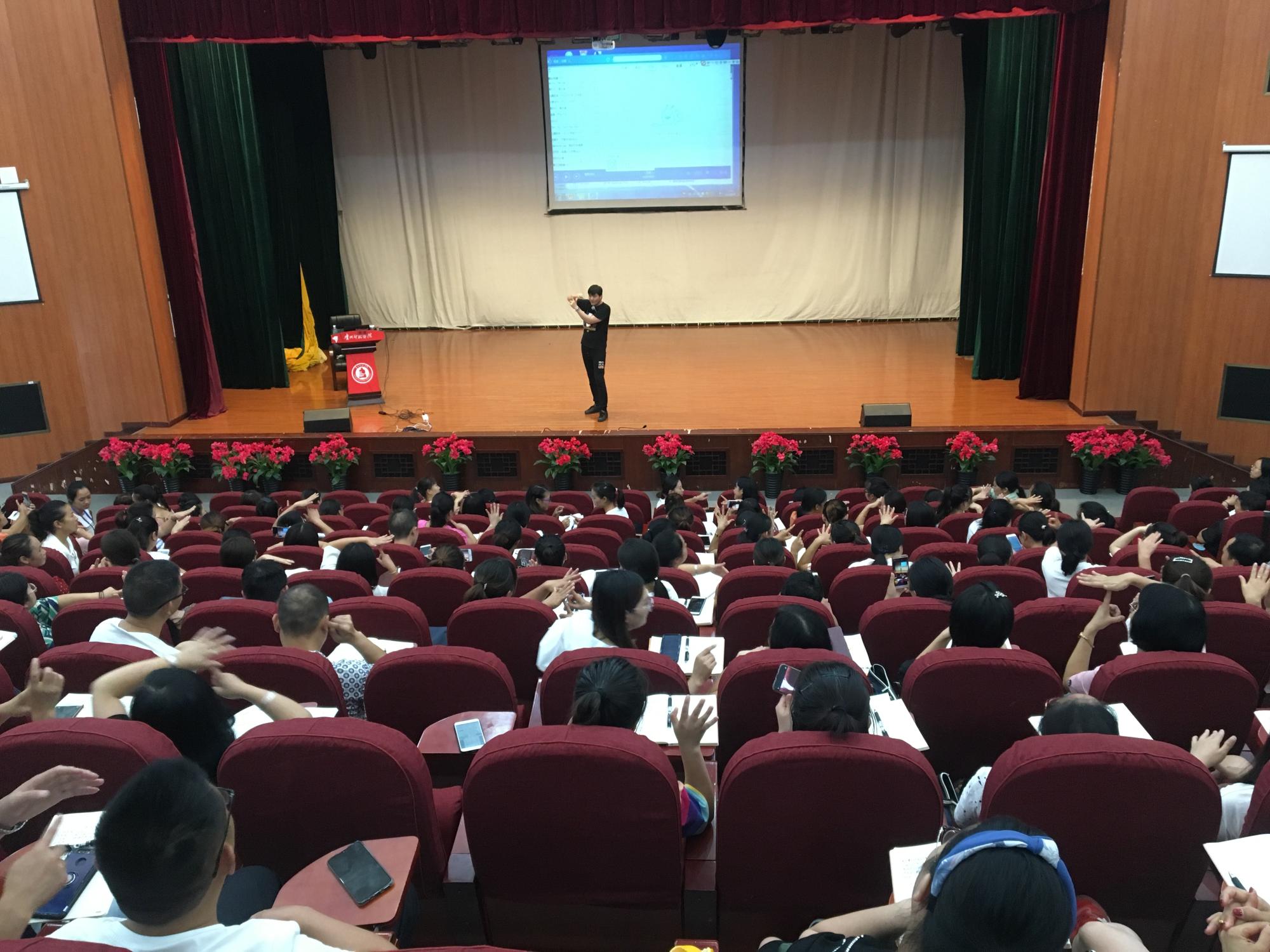 耿涛在讲座中主要从游戏化集体教学、游戏化歌唱教学、游戏化律动教学三个方面进行讲解,在讲授过程中不断穿插大量的小音乐游戏,与台下的学员积极互动,现场气氛十分热烈,整个课堂充满活力和激情。