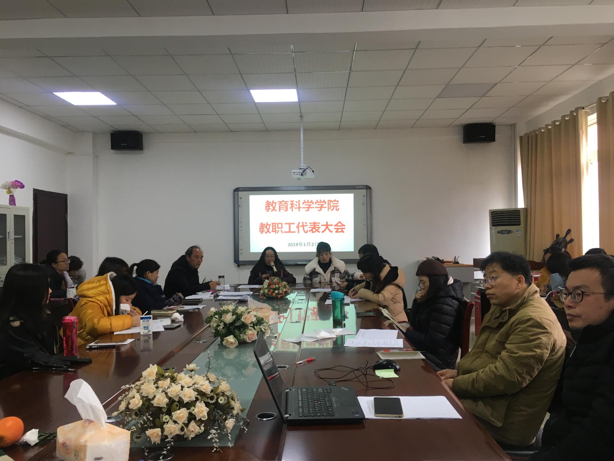 为进一步加强民主政治建设,充分调动广大教职工参与学院建设的积极性,2019年1月2日上午,教育科学学院在逸夫楼会议室召开教职工代表大会。学院党委书记彭祥友、院长刘红、副院长袁川以及全体教职工参加了此次会议。