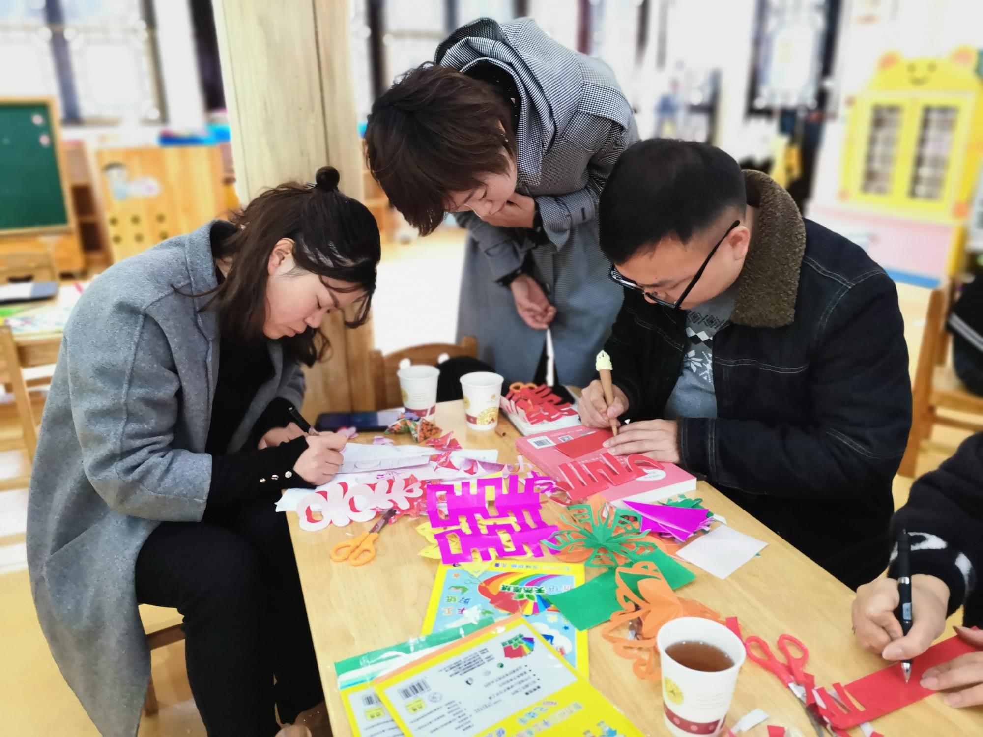 在活动过程中,申利丽教师与老师们进行了沟通、交流,对剪纸类型、技巧进行了探讨。老师们学习兴趣浓厚,全神贯注,同伴之间互相探讨、互相帮忙,用她们的巧手折叠出了一件件形象逼真、造型别致的作品。看着一张张精美的“喜”、“福”、“春”字及窗花图案,老师们纷纷感慨中国传统民间艺术的神奇力量。