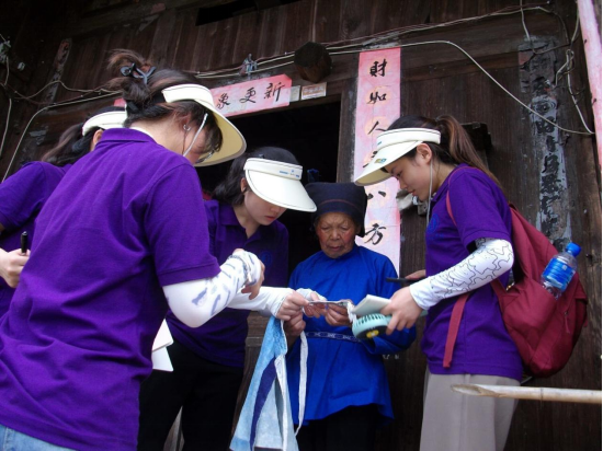 一组志愿者的主要采访对象为当地原住民。一位老人向队员们展示了自己的肚布,口述自制鞋衣、染布的部分过程。一位民族服饰店老板则向队员们展示了自己制作布依族服装的部分过程。二组志愿者们扛着锄头,提着镰刀,端着肥料,跟随村民的脚步,向田间出发。一望无垠的水稻田里零星的点缀着几片玉米地。二组队员分配任务,有序行动,迅速完成作业。