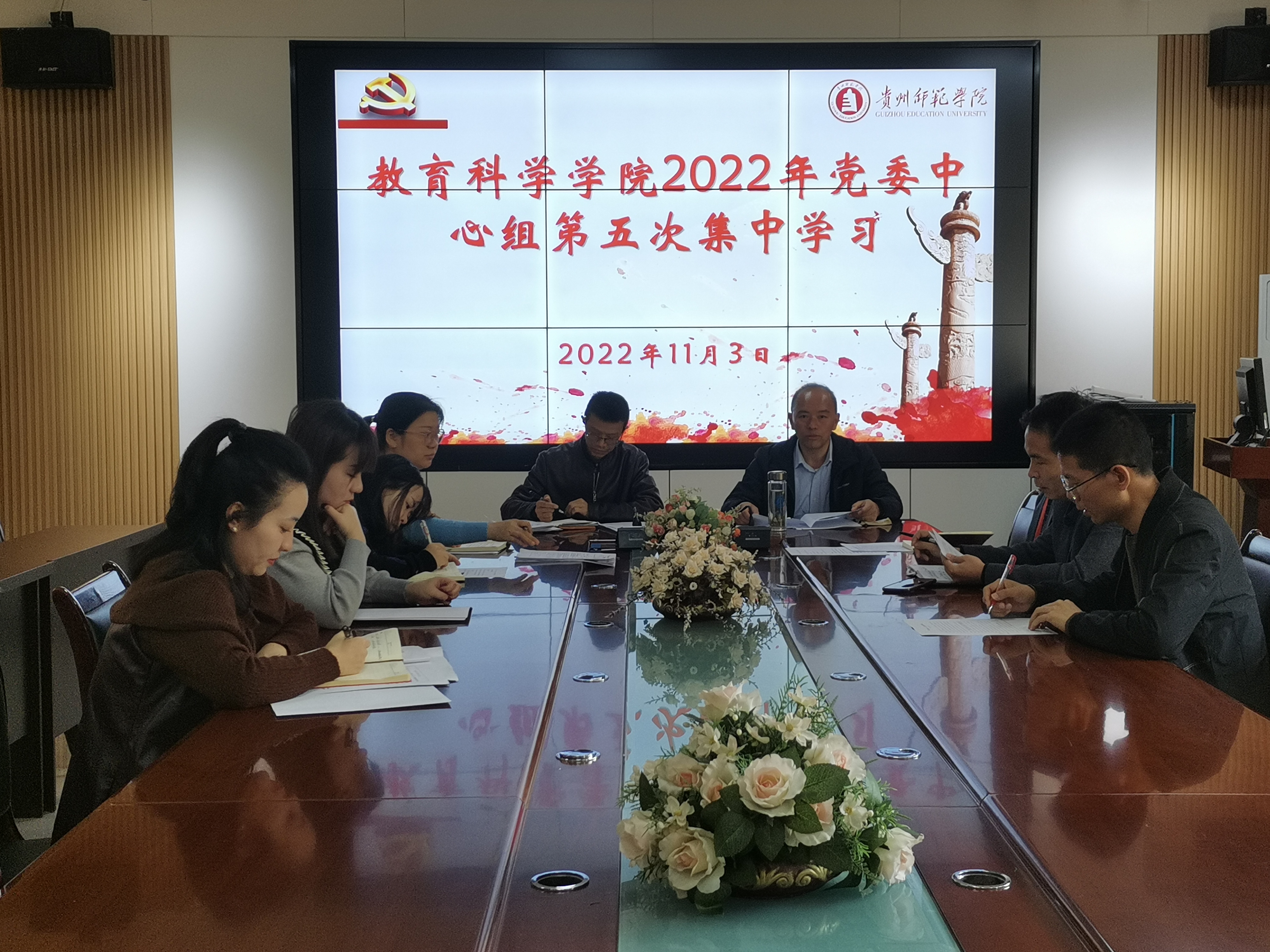 2022年11月3日下午,教育科学学院在逸夫楼三楼会议室召开2022年党委中心组第五次集中学习会议,专题学习贯彻党的二十大精神。学院党政领导、党委委员出席,各党支部书记、党政办公室主任、团委书记、工会主席列席。会议由院党委书记彭祥友主持。