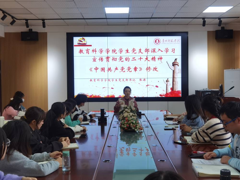 为深入学习宣传贯彻党的二十大精神,11月14日中午,教育科学学院学生党支部书记张源在学院会议室为学生党支部开展了学习贯彻党的二十大精神专题学习三。