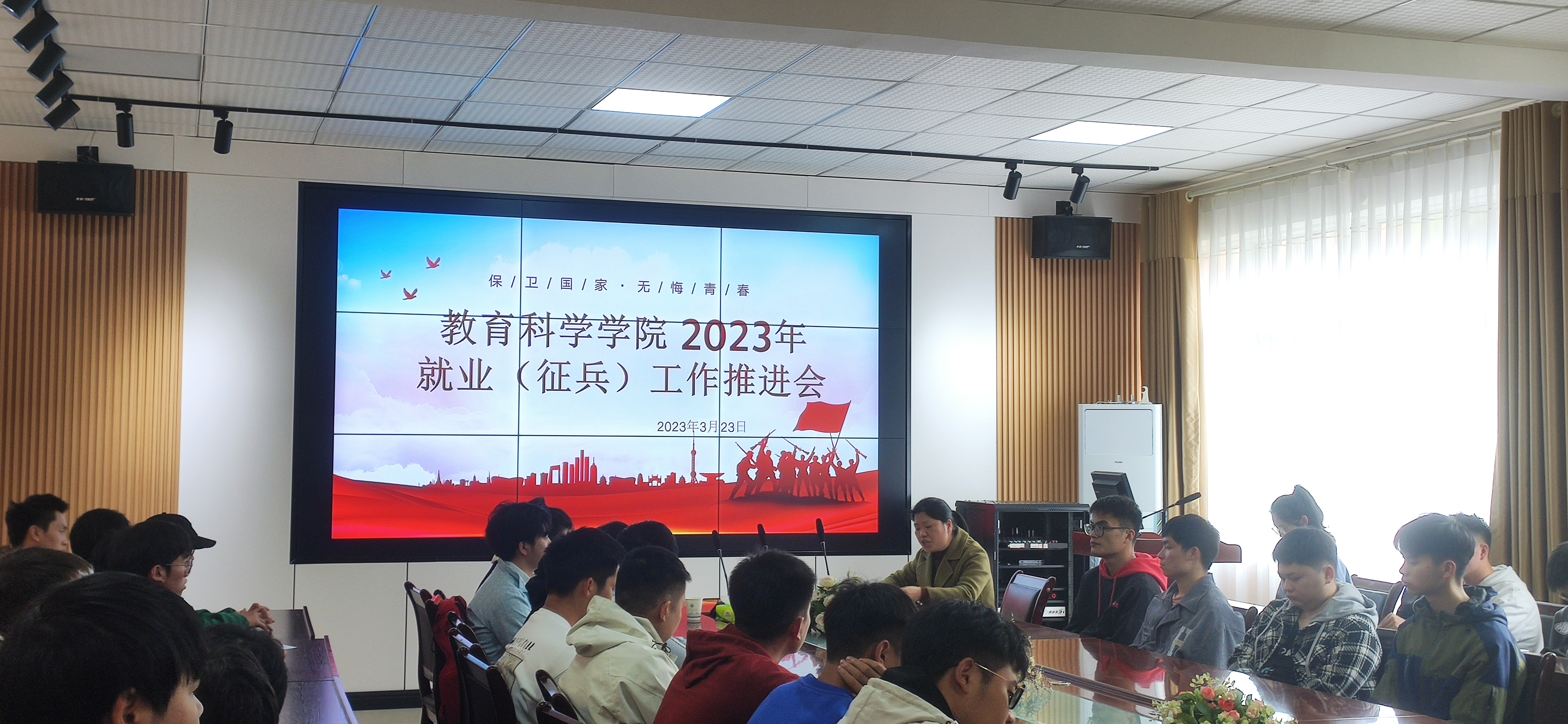 为了做好学校2023届毕业生就业(征兵)工作,3月23日,教育科学学院在逸夫楼321会议室召开了2023年大学生征兵动员暨就业推进会,学院党委副书记傅小芳、团委书记张源、退役大学生杨洪才和叶乐健、19级男生、20级男生共60余名学生参加了此次会议。