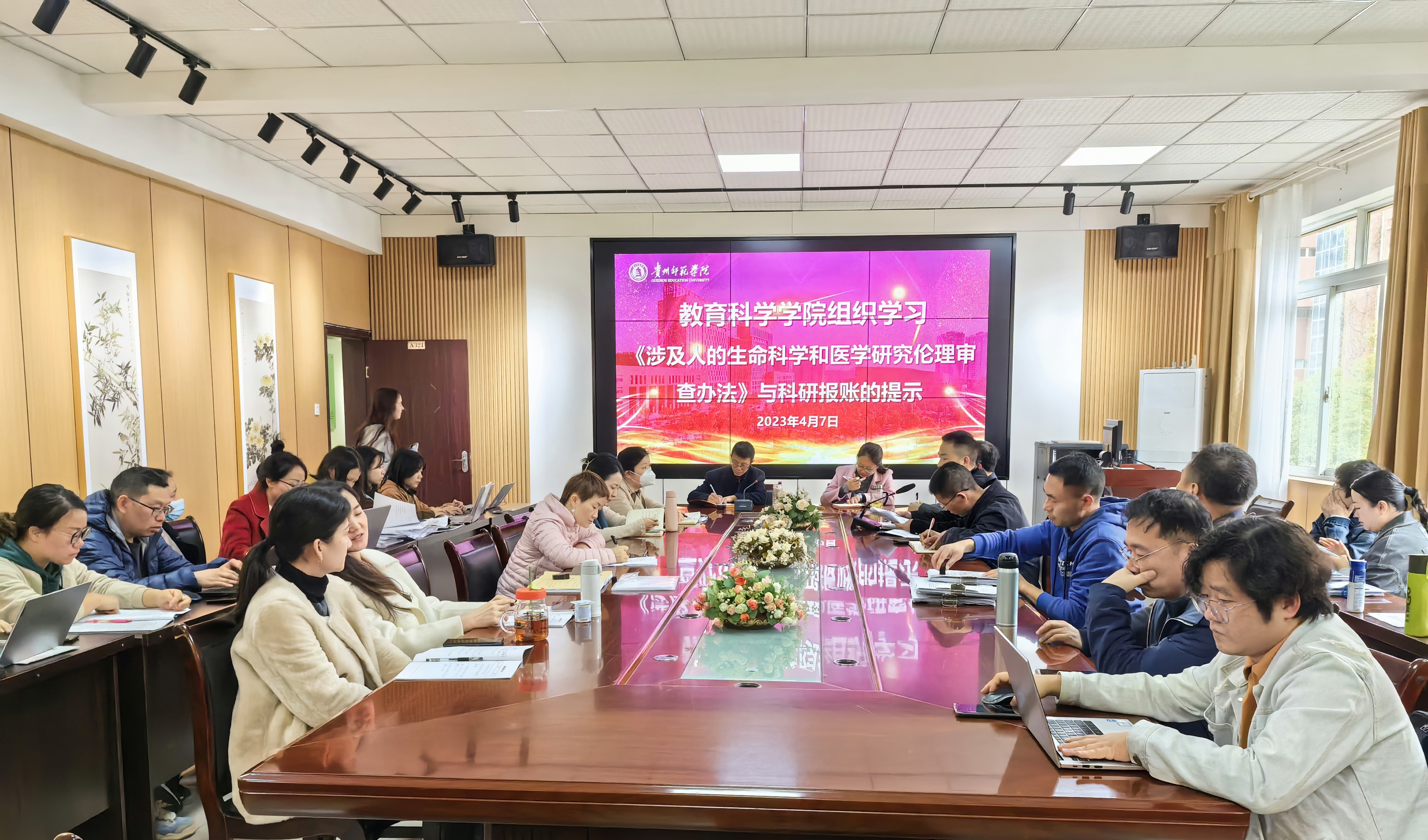 2023年4月7日下午教育科学学院在学院会议室开展《涉及人的生命科学和医学研究伦理审查办法》学习会。此次学习会由学院院长宋万琚主持,副院长袁川领学。