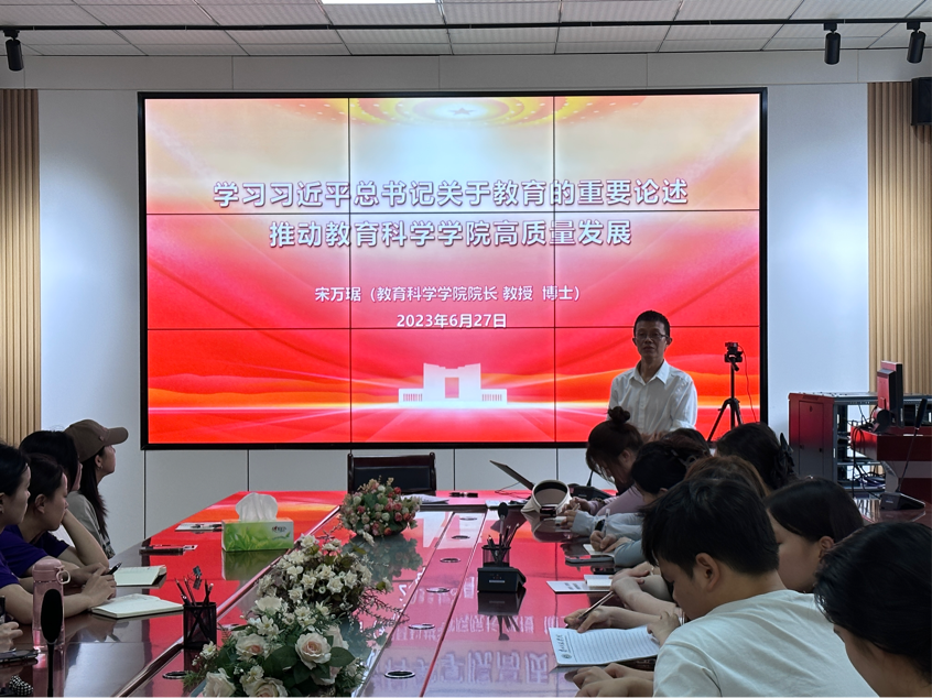 2023年6月28日,教育科学学院院长宋万琚在逸夫楼三楼会议室开展了专题党课讲授,授课主要围绕“习近平总书记关于教育的重要论述”和切实推动教育科学学院事业高质量发展等内容开展。教育科学学院全体预备党员、正式党员参与了本次专题党课。