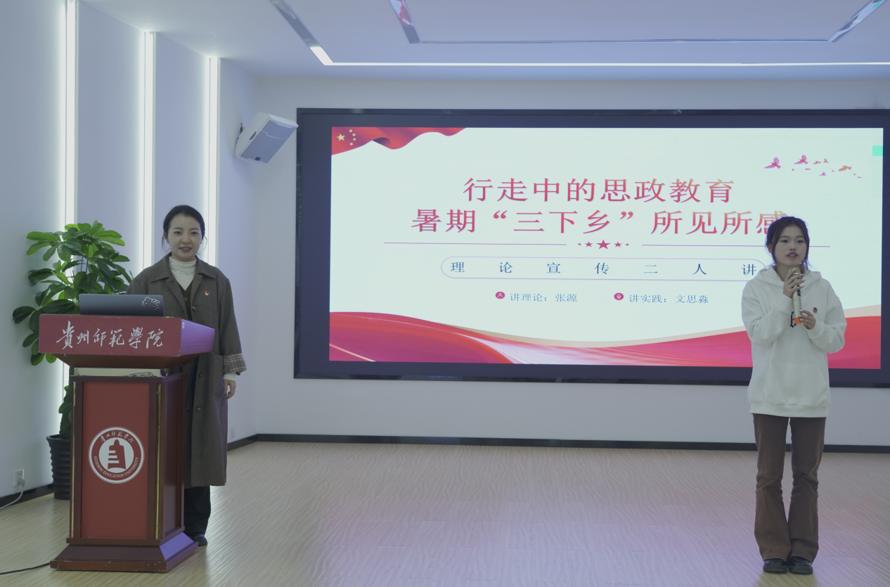 为高质量做好我院新时代党的创新理论“理论宣传二人讲”工作,有效推动党的创新理论学习入脑入心、宣传出新出彩、宣讲用心用情、落实见行见效,引导和帮助广大青年学生弘扬社会主义法治精神,在新时代新征程中了解国情、培养品德、增长才干,在社会实践中感知时代脉搏,担当时代使命,2023年10月20日下午,教育科学学院暑期三下乡社会实践服务队“未?少年护航”在贵州师范学院事务中心围绕“行走中的思政教育——暑期‘三下乡’所见所感”开展“理论宣传二人讲”宣讲。学院团委书记张源、项目负责人文思淼、服务队队员、学生党支部代表、童心绘梦艺术公益社团代表等50余人参加,宣讲以张源讲述下乡理论,文思淼负责人讲述下乡实践展开。