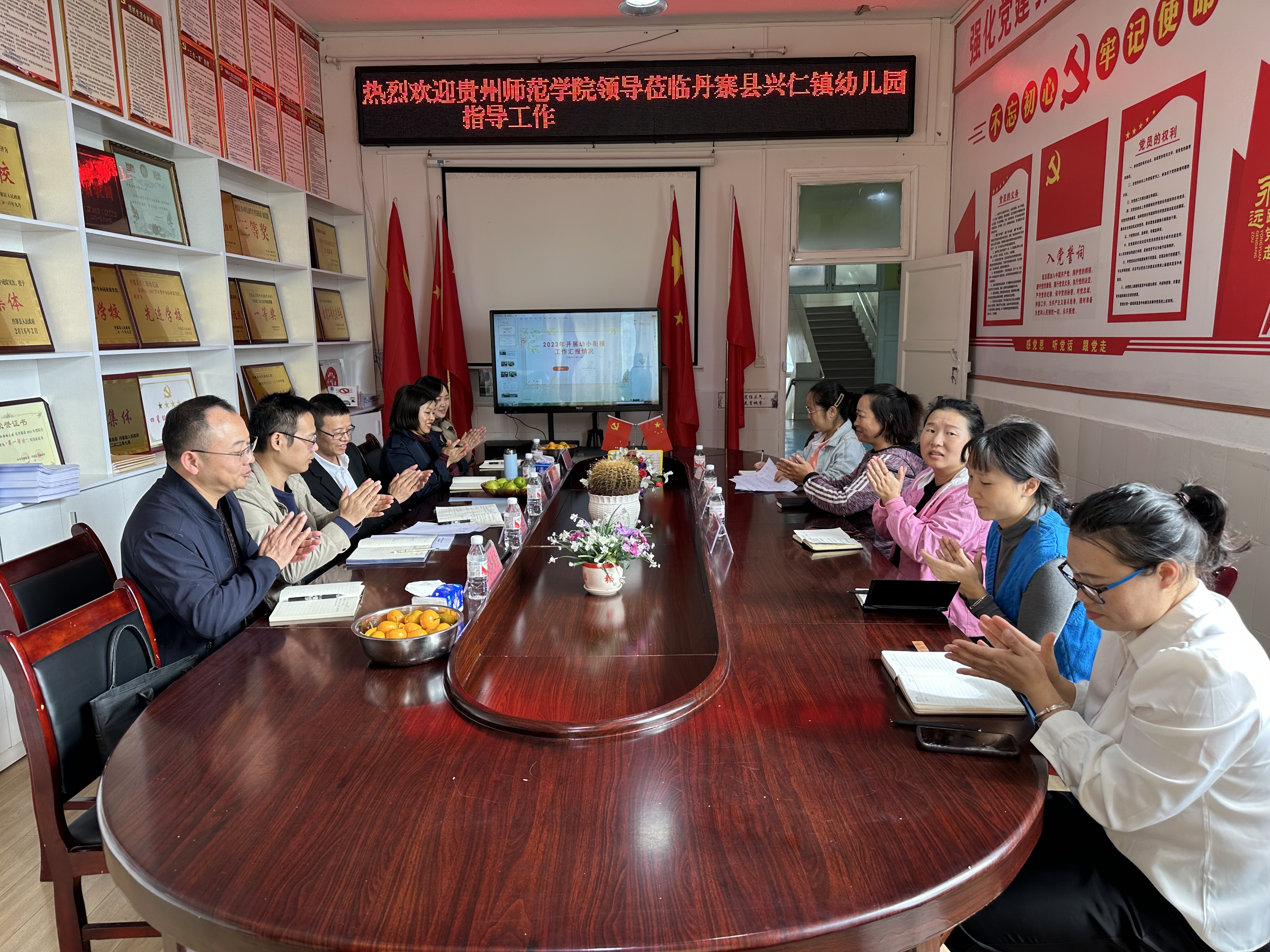 上午9:00,项目组团队前往丹寨县“兴仁镇幼儿园”,参观了幼儿园环境创设现状,并进行现场诊断;随后由此次培训的参训学员吴如燕老师,汇报了“幼小衔接”工作改进方案,到场专家进行了交流指导;座谈会第三项议程,幼儿园结合发展的实际情况、需要专家帮助的事项及未来合作发展方向进行了汇报和交流。