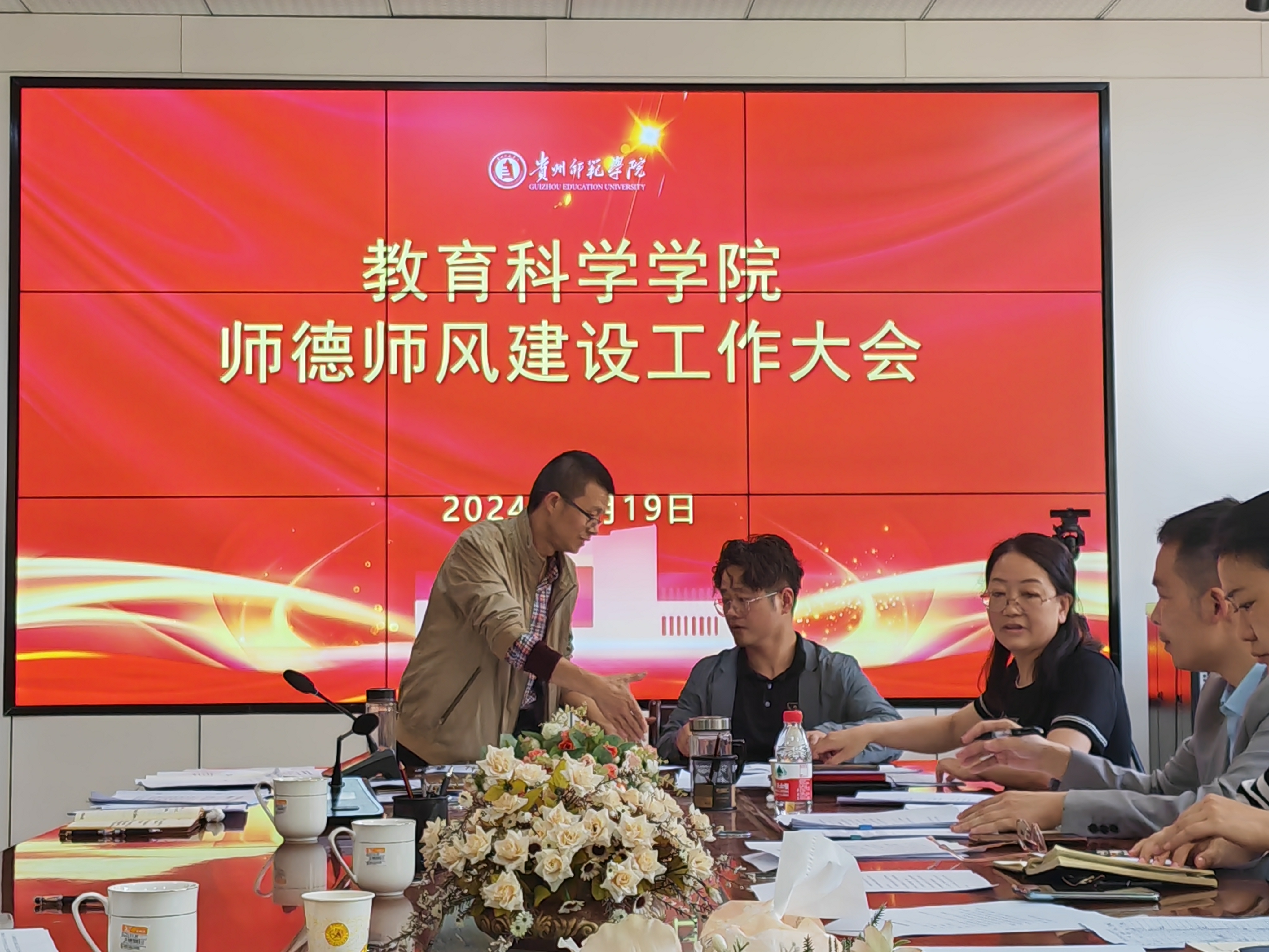 会上,依次由院长宋万琚传达学习了《教育部办公厅关于进一步压实高校师德师风建设主体责任的通知》,副书记傅小芳领学了《新时代高校教师职业行为十项准则》,分管副院长袁川传达学习《贵州师范学院进一步压实二级学院师德师风建设责任实施办法(试行)》《贵州师范学院师德师风突出问题专项整治行动实施方案》。袁川通报了学校师德师风相关情况,并就学院师德师风突出问题专项整治工作做了安排。