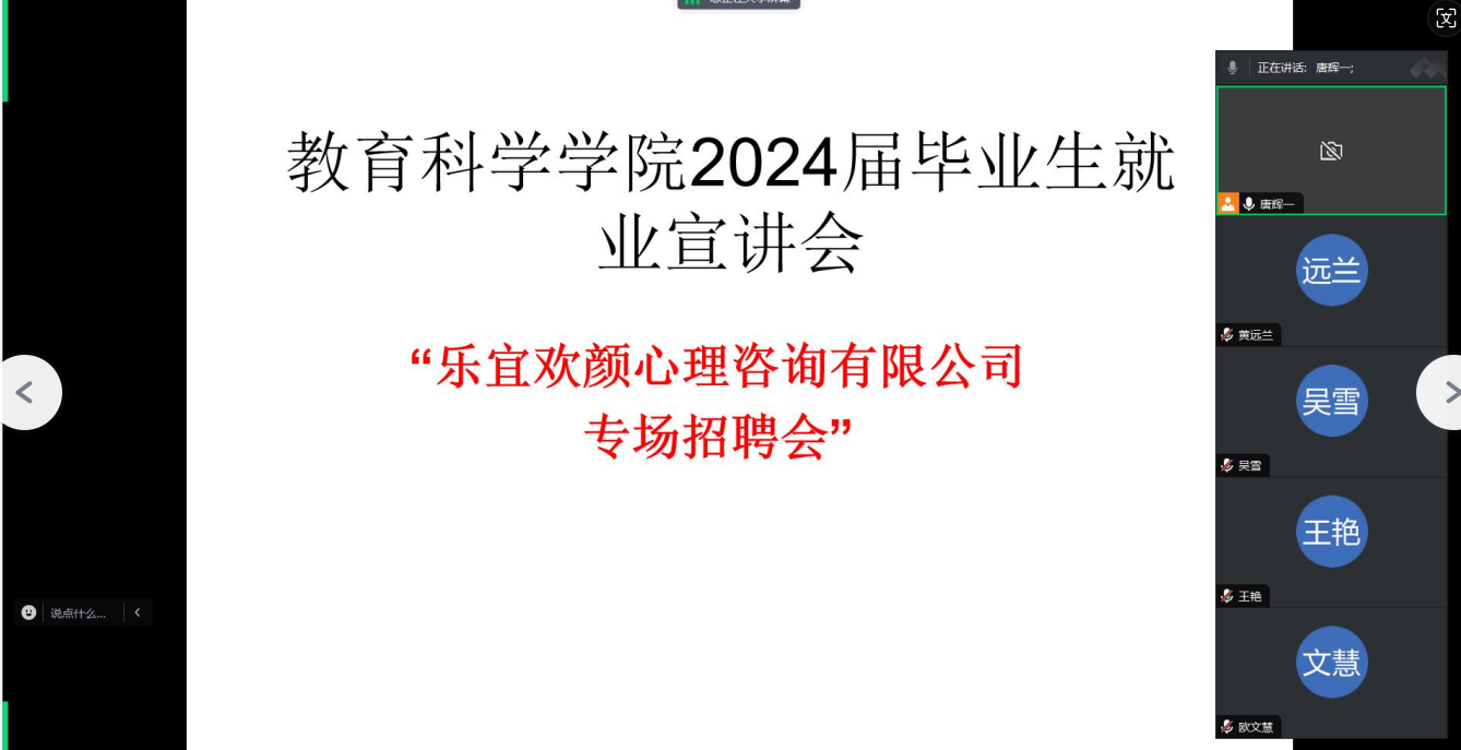 为促进应用心理学专业毕业生顺利就业,5月11日,教育科学学院举行了应用心理学专业线上专场招聘会,应用心理学系主任倪磊、2020级应用心理学班辅导员唐辉一、2020级应用心理学毕业生共50余人参加了此次招聘会。此次招聘会由唐辉一主持。