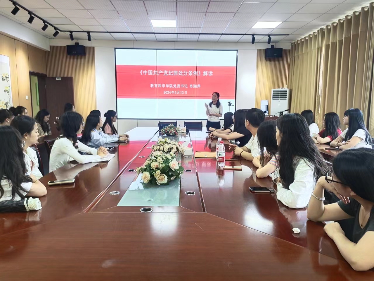 为扎实推进党纪学习教育,深入学习贯彻新修订的《中国共产党纪律处分条例》,进一步增强党员党性修养。6月13日,教育科学学院党委书记肖湘萍作新修订《中国共产党纪律处分条例》解读专题讲座,学生党支部代表参加。