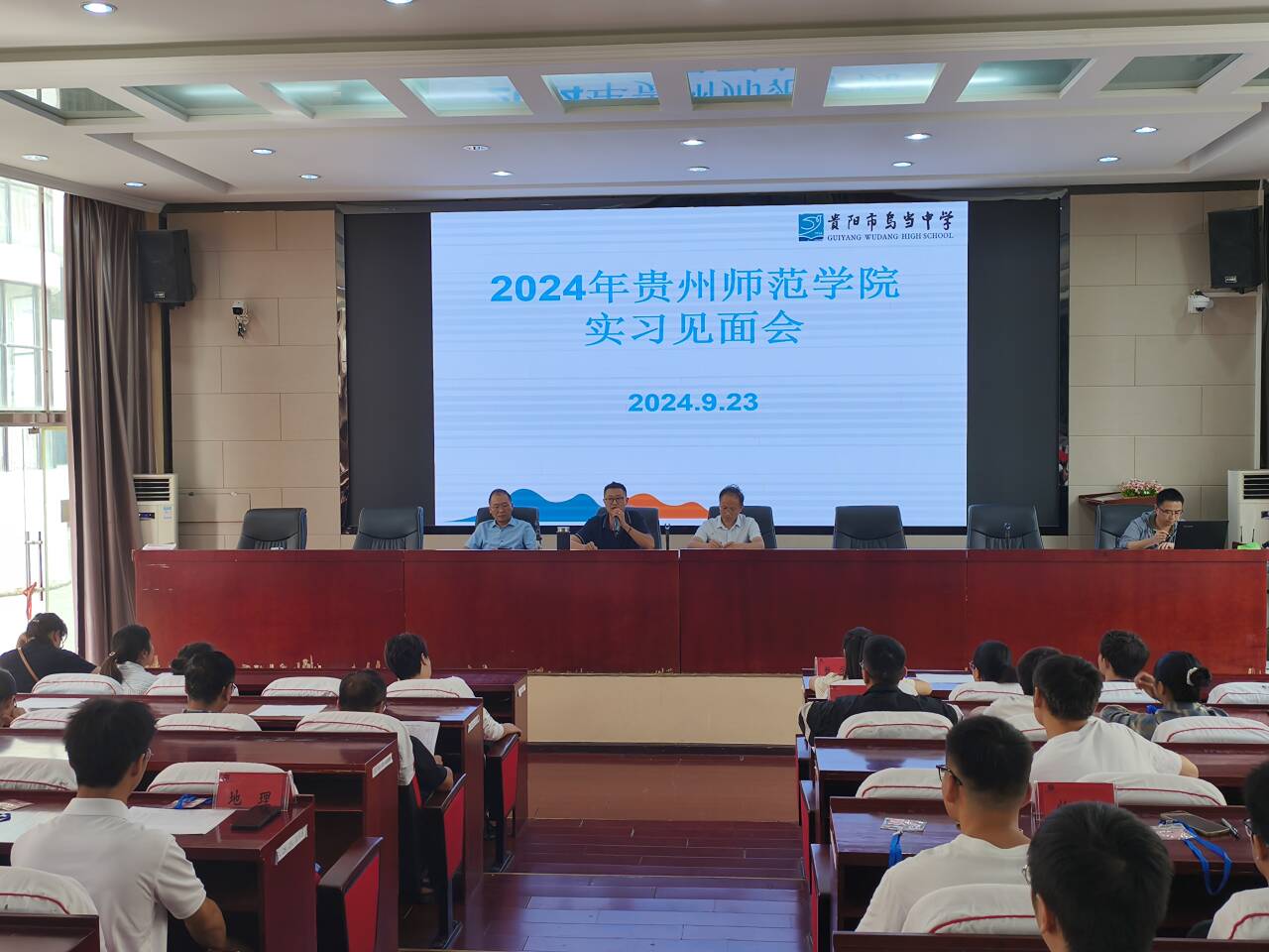 10月23日上午,为让我校实习生在实习单位能更好地实习,教育科学学院副院长黎平辉、办公室助理田壹送实习生到贵阳市乌当区乌当中学报到,并出席了贵阳市乌当区乌当中学的实习生见面会,对乌当中学实习指导教师现场进行了培训。