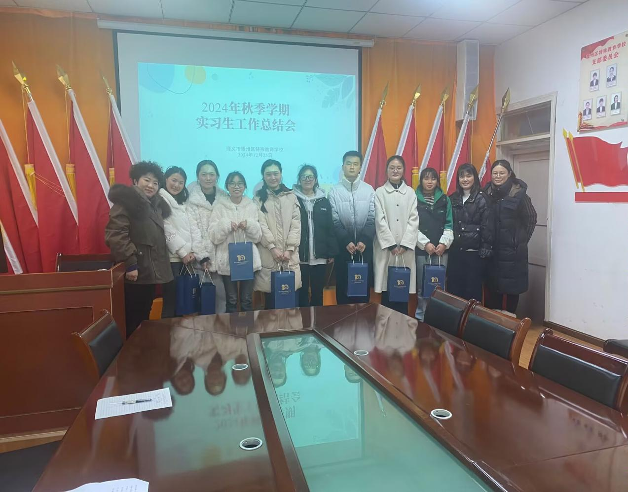 12月23日,播州区特殊教育学校隆重召开了2024年实习工作总结会。此次会议旨在回顾和总结特教系6名实习生为期4个月的教育实习工作,并对表现优秀的实习生进行表彰。贵州师范学院特殊教育系的安文军老师、播州区特殊教育学校校长杨启勇、副校长彭章丽以及全体实习生共同参与了此次活动。与会人员认真回顾了实习生们在教育实习期间的点滴经历,分享了他们在实践中所获得的宝贵经验和深刻体会。