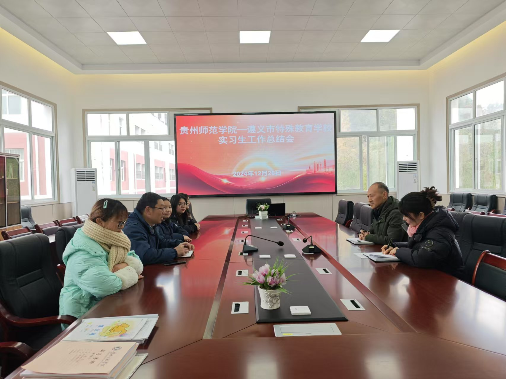 2024年12月26日上午,我校教育科学学院特殊教育系主任雷经国赴遵义市特殊教育学校开展教育实习工作总结,实习总结大会在遵义市特殊教育学校举行,参会人员还有遵义市特殊教育学校副校长赵石、教务处主任徐文婧以及所有实习生。