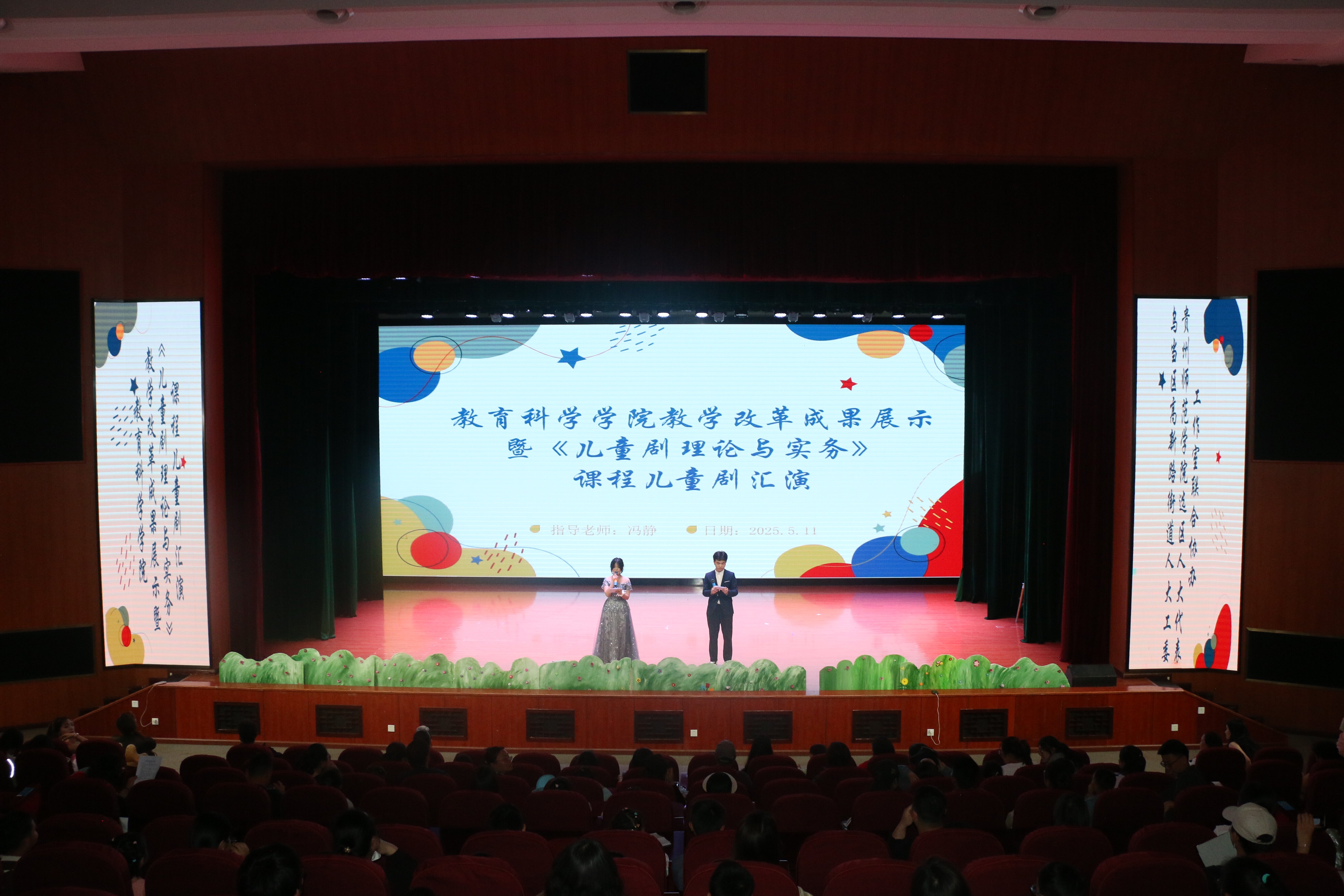 为了凸显学生主体地位,调动学生积极性,提升学生综合实践能力,实现课程服务社会的重大意义,2025年5月11日下午,贵州royal皇家88平台学前教育专业《儿童剧理论与实务》课程汇演在逸夫楼演播厅举行。本次汇演由冯静老师带领2022级学前教育专业全体同学进行,主要面向贵阳市各区域幼儿园、乌当区高新路街道人大工委、贵州师范学院全体教职工子女,共计500余人观看。此次演出是我校实践教学改革、专业建设与社会服务共融共通成果的综合展示。