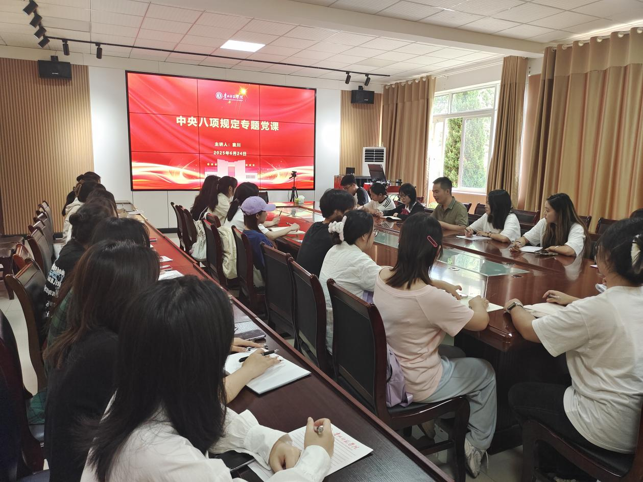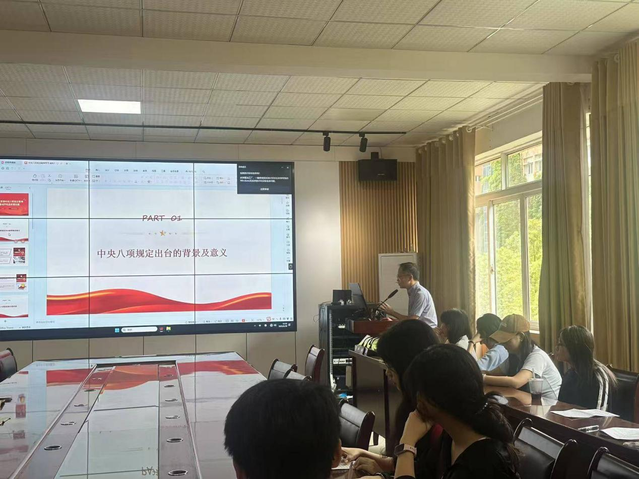 6月24日,副院长袁川与学生党支部党员分享中央八项规定的典型案例。通过一个个真实且生动的案例,他深入浅出地阐述了中央八项规定在实际工作和生活中的具体体现,让党员们深刻认识到中央八项规定对于规范党员行为、维护党和政府形象的重要性。这些案例不仅是警示,更是行动指南,促使党员们时刻保持警醒,严格自律。
