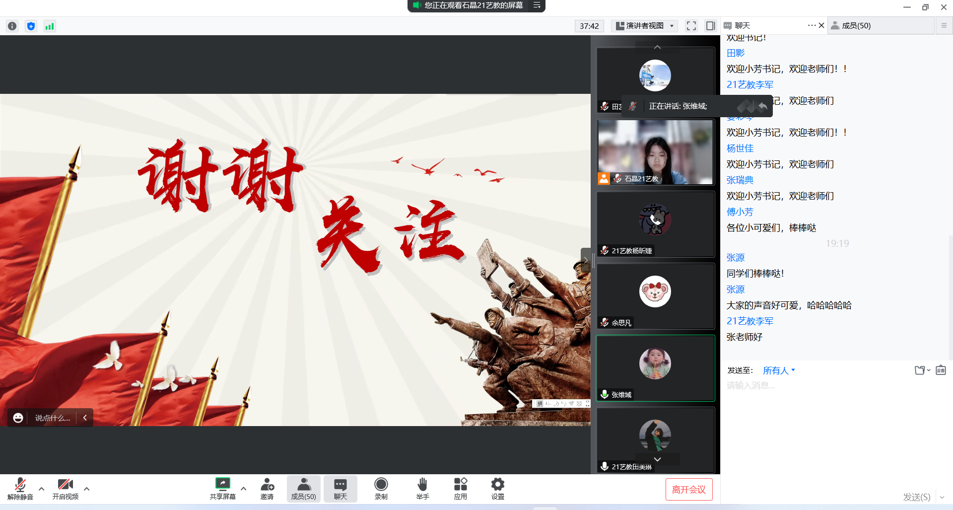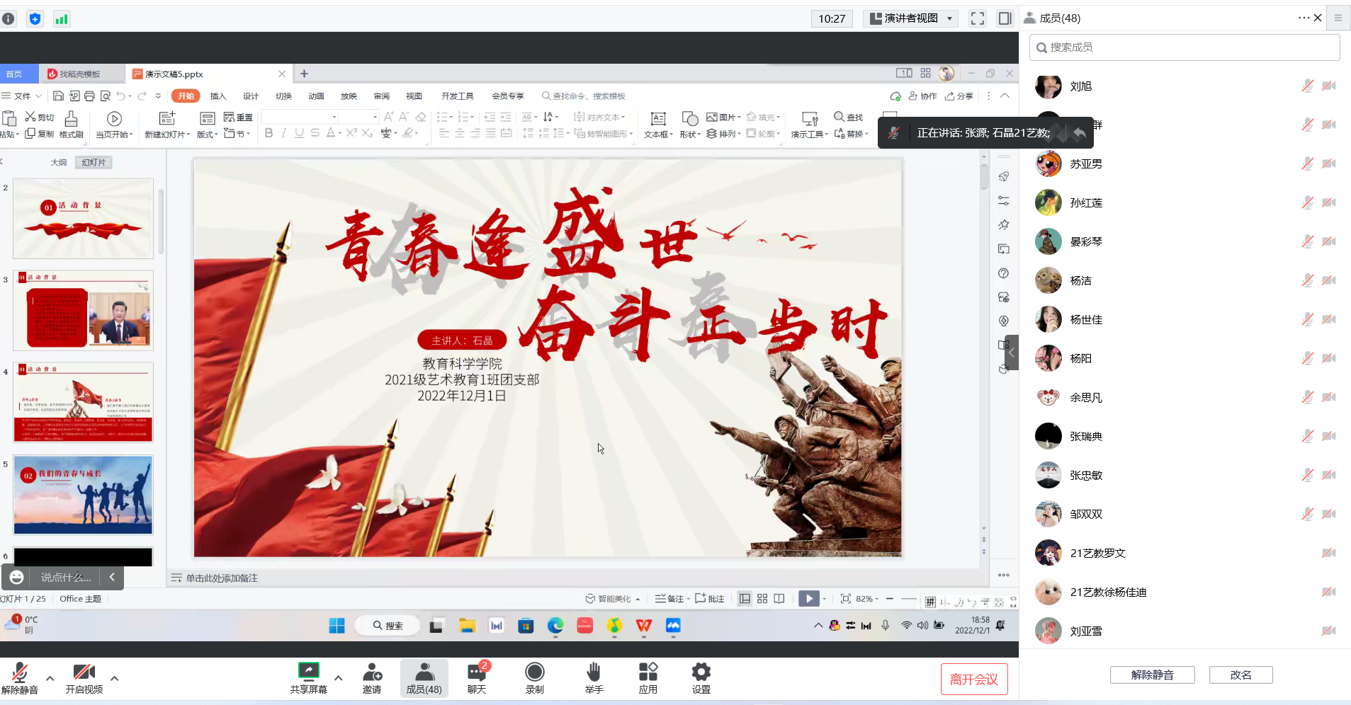 为庆祝党的二十大胜利召开,增强青年学子的历史责任感和使命感,丰富疫情期间的大学文化生活,提高身心健康素质,12月1日晚七点2021级艺术教育团支部举办了“青春逢盛世,奋斗正当时”线上主题团日活动。参与此次团日活动有校团委社会实践部部长张维域院党委副书记傅小芳院团委书记张源、辅导员申苒以及2021级艺术教育班全体成员,活动班级团支书石晶主持