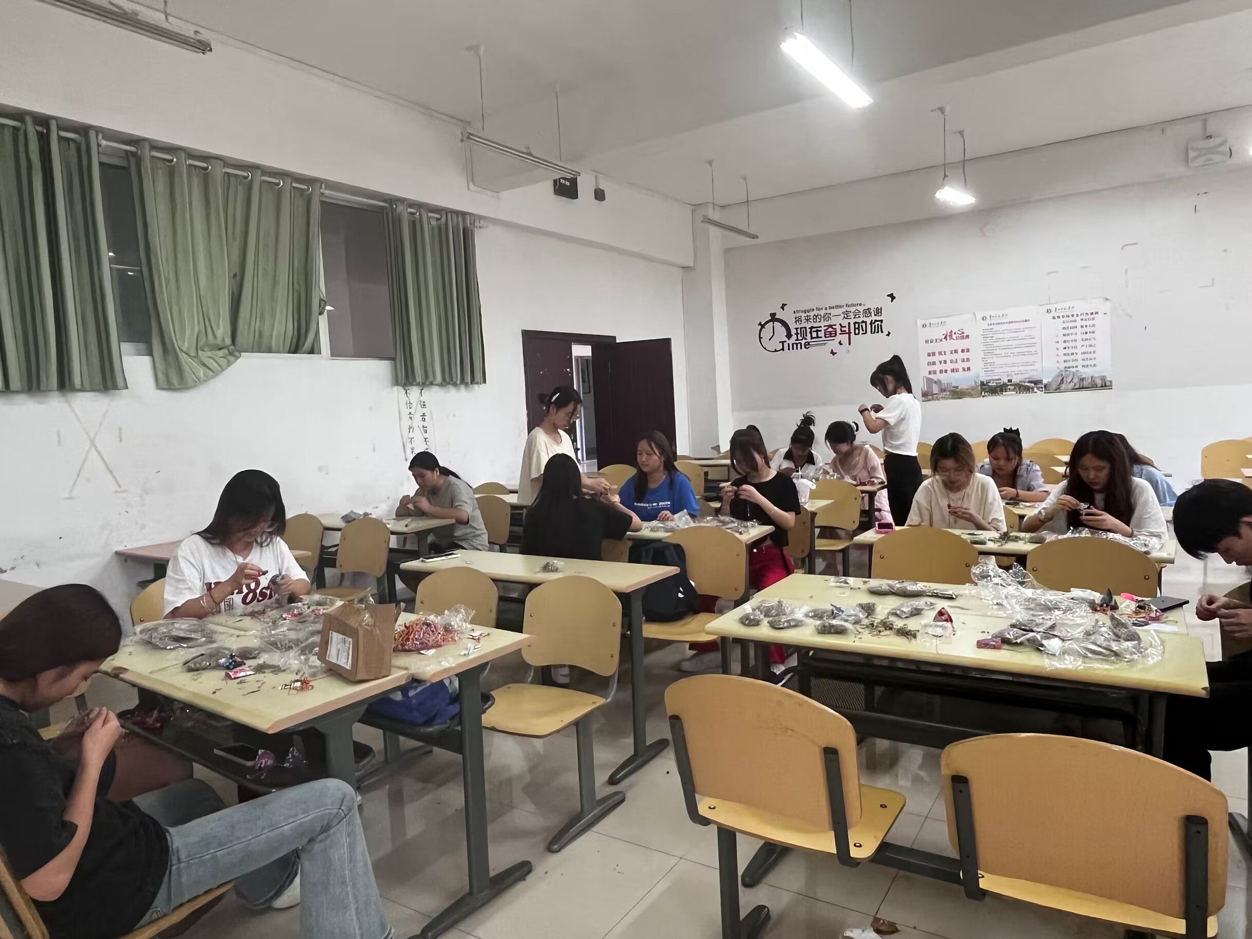 本次活动主要面向所有社团成员开展,活动形式新颖。在活动现场,组织人员分工明确、秩序井然,参与的同学们都迫不及待地登记、领取属于自己的手工DIY原材料。参与者们根据教程,在同学们的协助下,一针一线,制作得津津有味,脸上洋溢着开心的笑容。活动最后,参与者们还可以自行领取端午粽子手链。