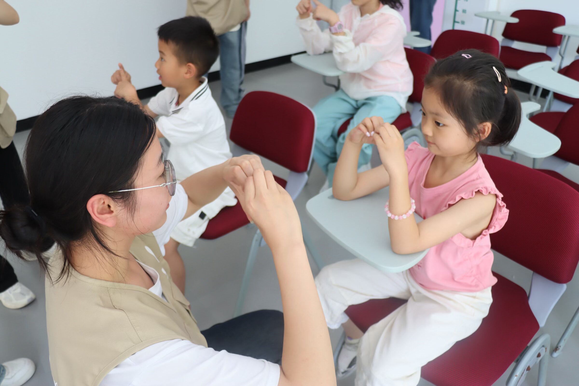 活动开始时,音乐舞蹈组的志愿者率先登场,伴着轻柔的音乐完整演绎了一遍手势舞。舒展的手臂、灵动的指尖配合着歌曲旋律,瞬间抓住了孩子们的目光,不少孩子已经忍不住跟着比划,参与热情被迅速点燃。随后,志愿者们开始逐句教学。“先双手合十放胸前,然后慢慢打开向上伸。”志愿者一边讲解,一边温柔地纠正孩子们的姿势。孩子们认真地模仿着,小手掌紧紧合在一起,又缓缓打开伸展,虽然动作还有些生涩,但眼神里满是专注。遇到动作不太标准的孩子,志愿者便蹲下身,握住他们的小手,耐心地一遍又一遍示范。在志愿者的引导下,孩子们的动作逐渐流畅起来,最后,随着音乐再次响起,孩子们已能整齐地完成整套手势舞。稚嫩的动作里满是认真,脸上绽放着自信的笑容。