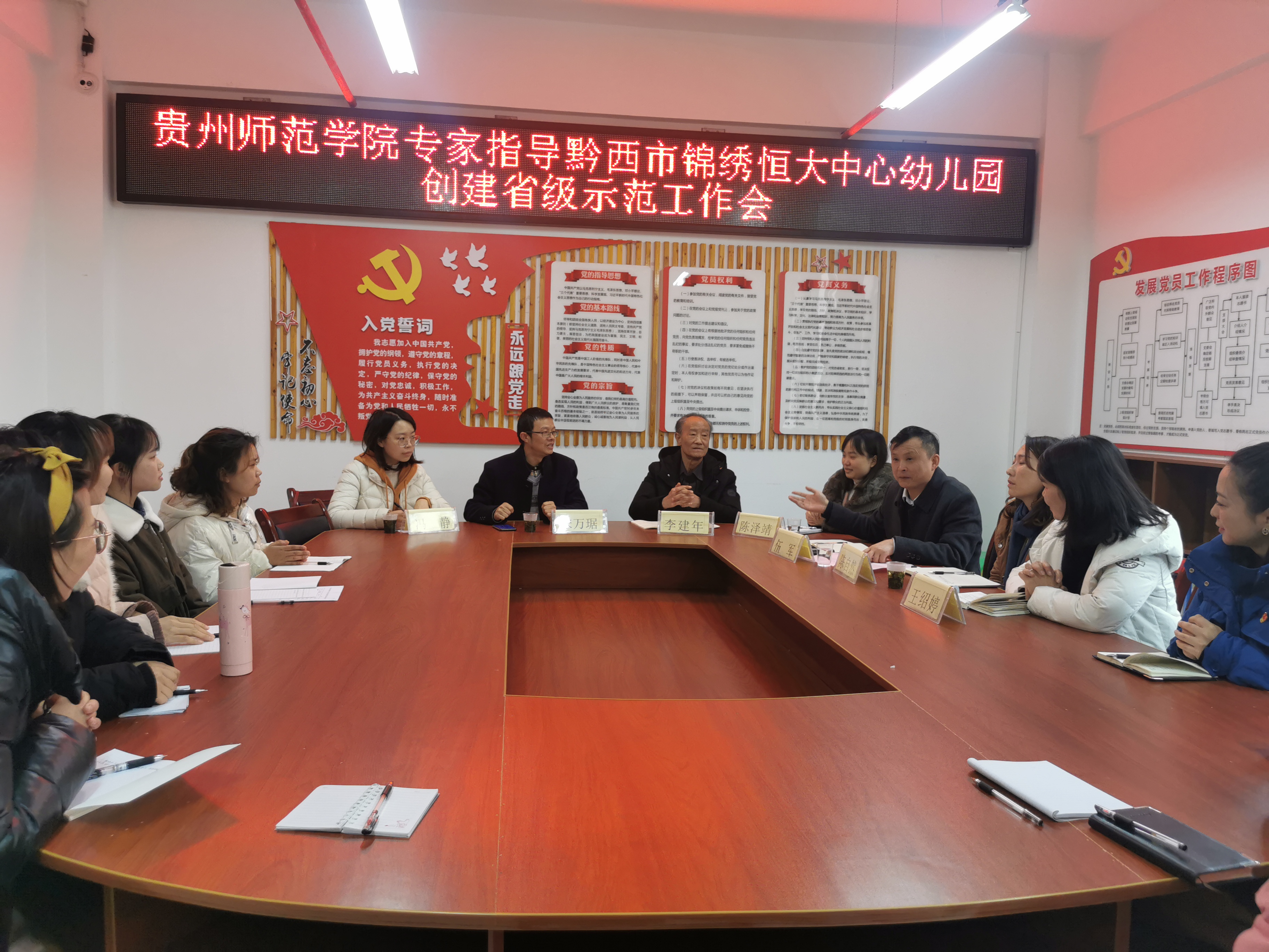 2022年1月5日下午,贵州royal皇家88平台宋万琚院长、李建年老师、陈泽婧老师、冯静老师等一行四人前往黔西市锦绣恒大中心幼儿园,参加该园组织的“创建省级示范工作指导会”。参与会议的人员还有黔西市教育科技局学前教育质量中心主任伍军、黔西市学前教育质量中心教研员陈自然、黔西市锦绣恒大中心幼儿园园长王绍婷以及该园的全体主班教师等。