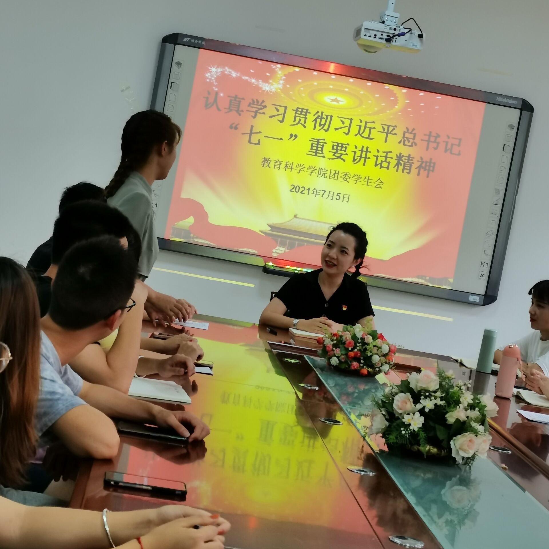 7月1日庆祝中国共产党成立100周年大会在北京天安门广场隆重举行。中共中央总书记、国家主席、中央军委主席习近平发表重要讲话。教育科学学院组织党员干部师生集体收听收看大会盛况,通过多种形式学习热议习近平总书记重要讲话精神,掀起学习宣传贯彻热潮。7月5日,教育科学学院团委书记张源老师带领团委学生会全体成员在会议室召开会议,深入学习习近平总书记7月1日在庆祝中国共产党成立100周年大会上的重要讲话精神。