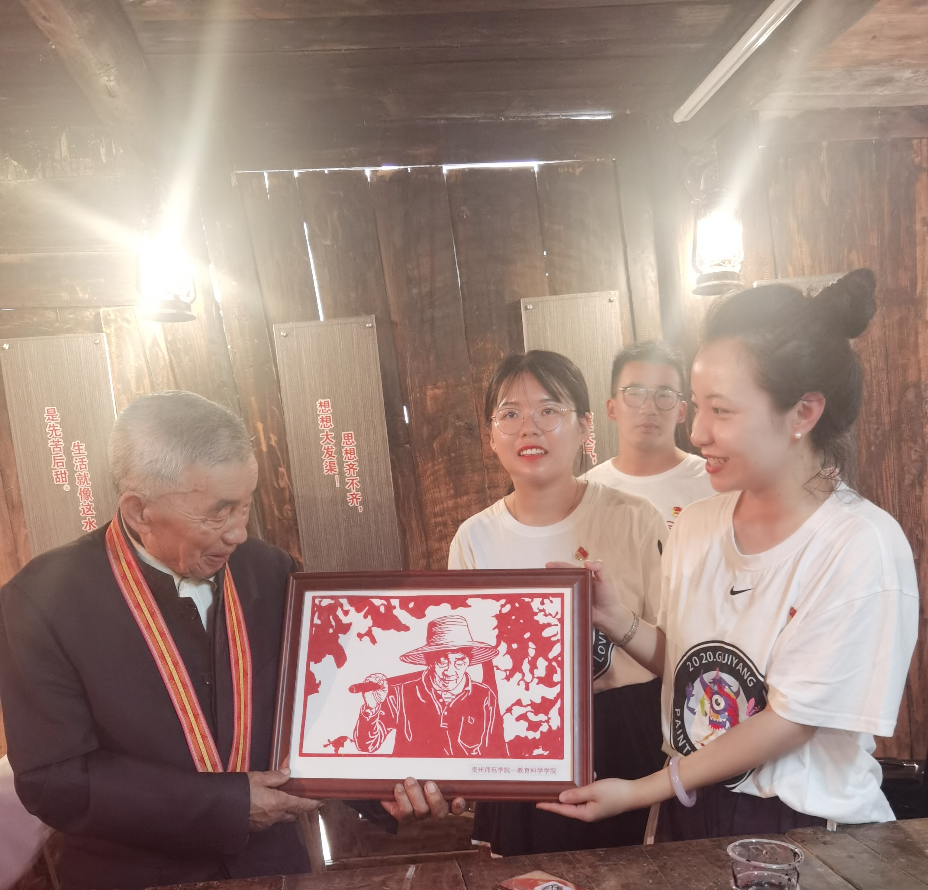 一行人早上从学校出发,中午到达遵义市播州区团结村。中午饭后首先走进了大发渠,亲身感受大发渠的险峻。走在渠边,脚下就是几百米深的悬崖。当地人指着“天渠”最险处说,一般人都不敢去。随后,下午3点,有幸聆听黄爷爷授课,他说:“我是贫困山区的一名普通党员,在人民大会堂受到习近平总书记的接见,挨着他坐,我感到非常光荣。我们做出一点小事,老百姓记得住我们,党也记得住我们,我感到无比自豪。”渠通了,水来了,草王坝也开始稻花香里说丰年。然而黄爷爷并没有歇下来,他继续带领村民拉电、修路、建学校。“我这一生就是做好工作,有一口气就要干一天,为人民奋斗一辈子。”黄爷爷嘱咐我们,踏实做好自己的岗位工作就是为国家为人民做贡献。临别时,我们为黄爷爷送上了学院的剪纸作品,黄爷爷表示非常喜欢。