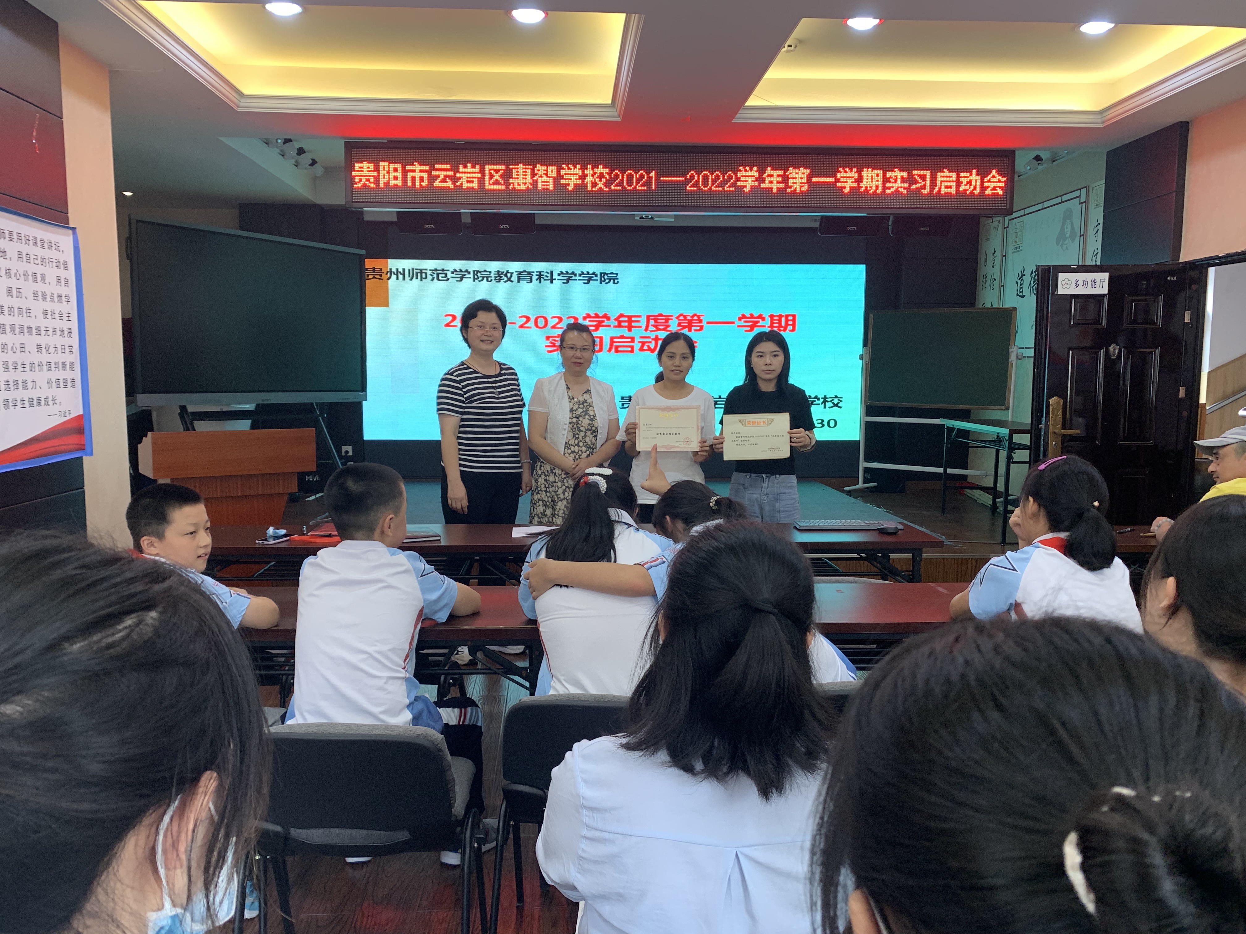 首先,夏卉芳老师和云岩区惠智学校赵校瑛主任给云岩区惠智学校陈丹、马琴2位老师颁发教育科学学院2020-2021学年度校外优秀实习指导教师荣誉证书。