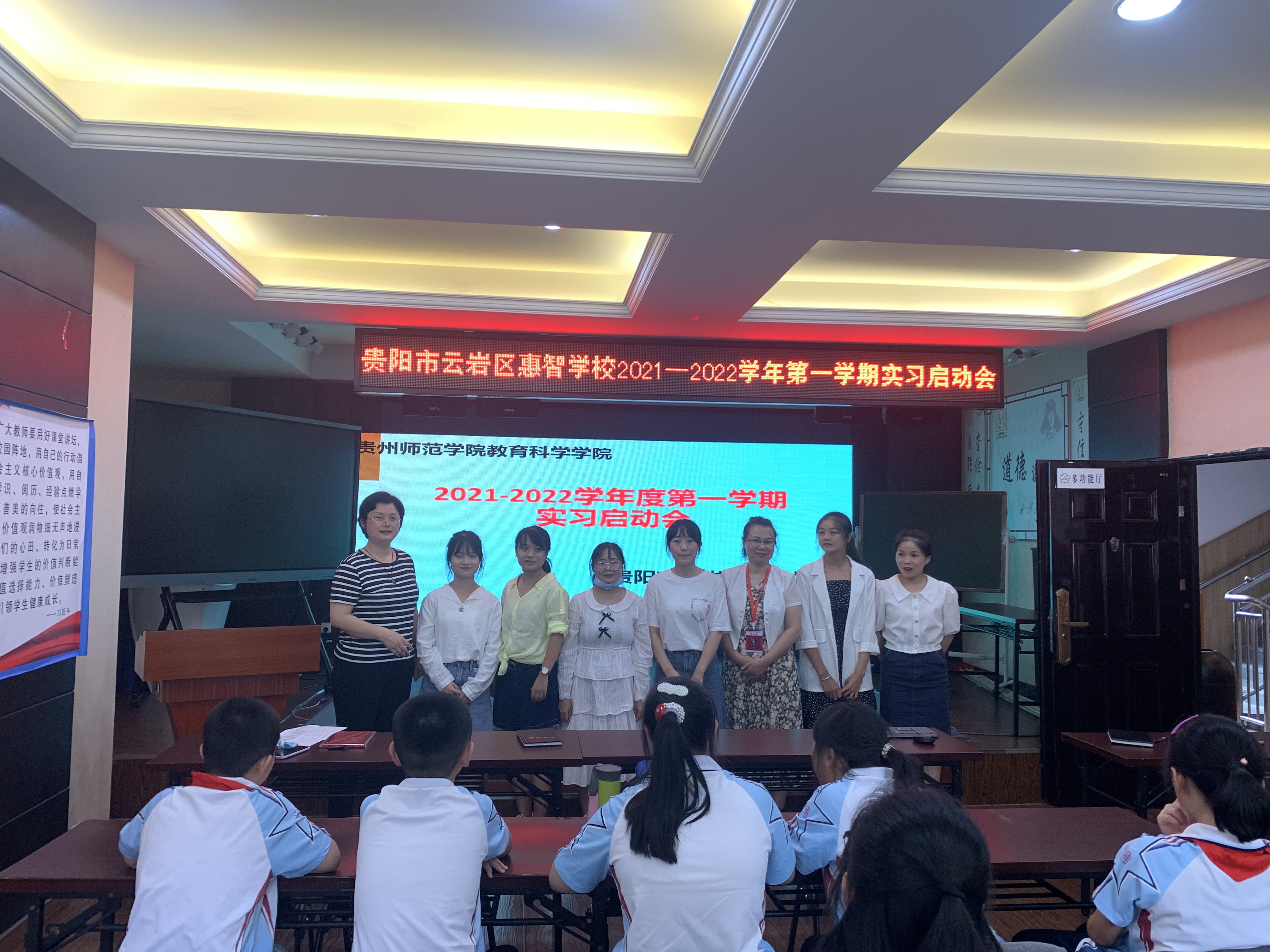 2021年8月30日教育科学学院负责云岩区惠智学校实习工作对接的夏卉芳老师,带领2022届特殊教育专业10名学生到云岩区惠智学校报到,并在云岩区惠智学校实习启动会上做了相关工作的对接,对实习指导老师进行了培训。