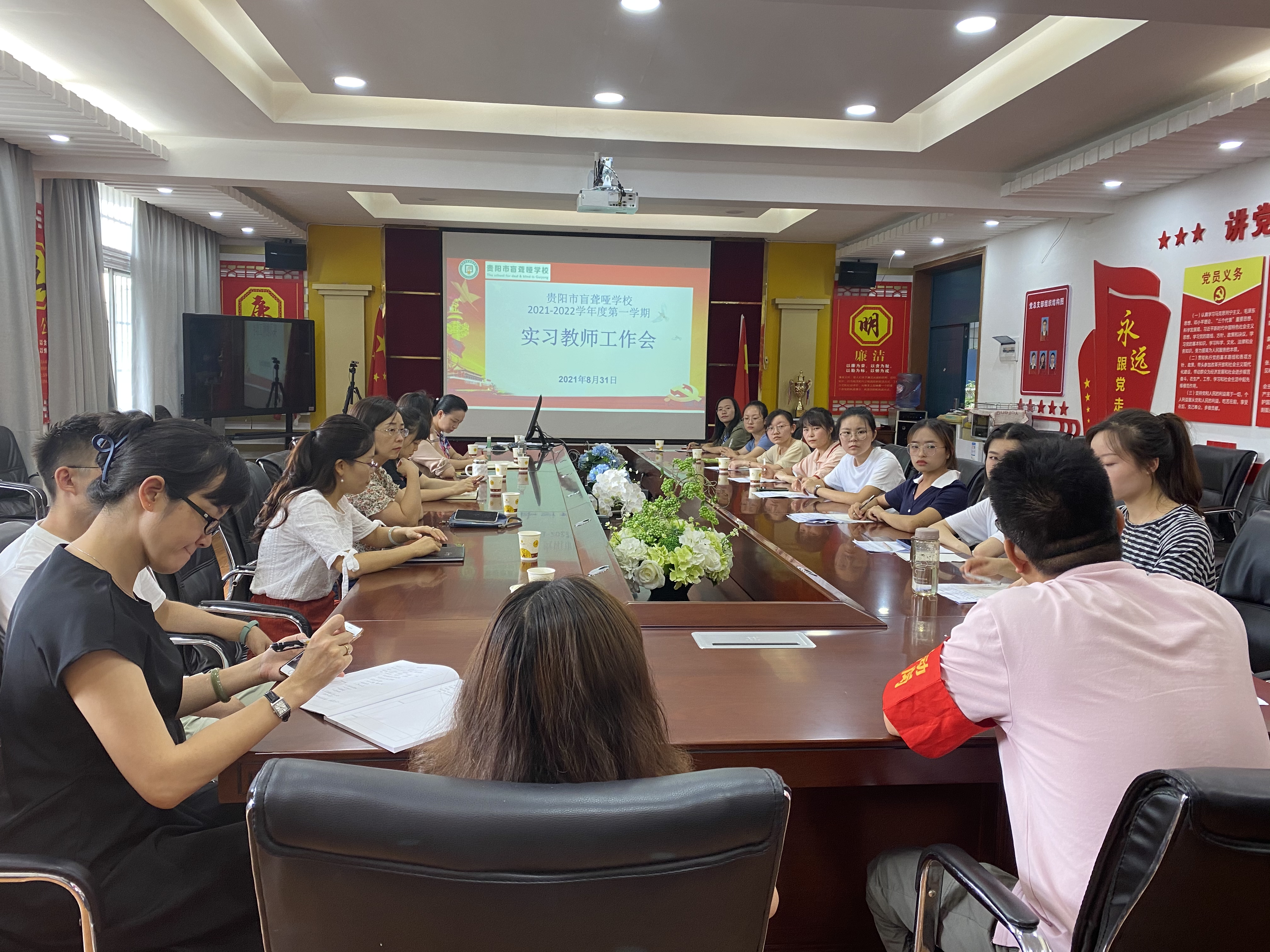贵阳市盲聋哑学校2021-2022年度第一学期“实习教师工作会”在早上10:00如期开展。参加会议的成员有贵阳市盲聋哑学校的各部门负责人、学科指导教师、班主任指导教师、实习学生以及贵州师范学院带队教师杨娟等。