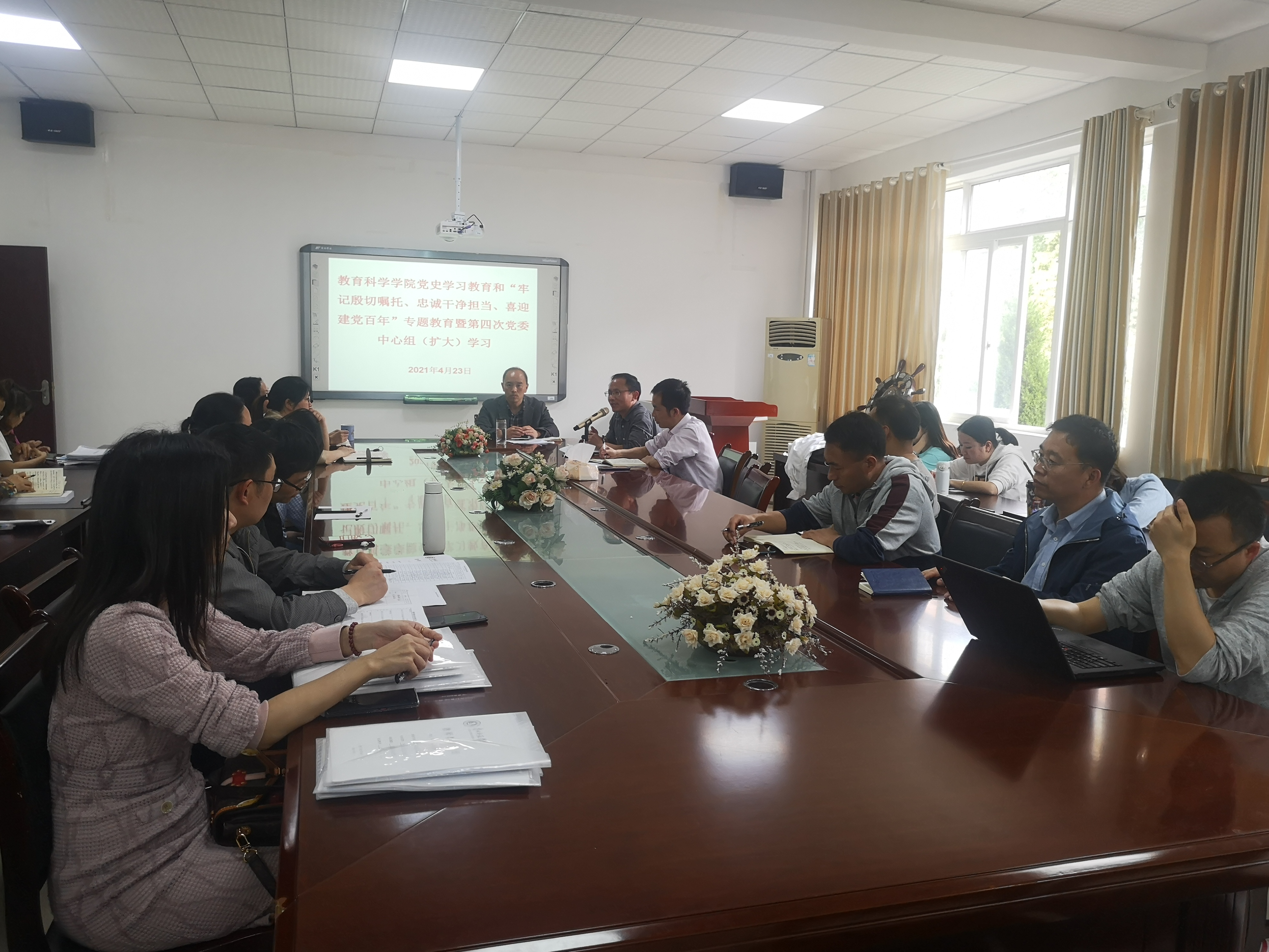 2021年4月23日中午,教育科学学院在逸夫楼学院会议室,举行党史学习教育和“牢记殷切嘱托、忠诚干净担当、喜迎建党百年”专题教育暨第四次党委中心组(扩大)学习,学院党委书记彭祥友主持学习,学院党委中心组成员,全体教师党员参加。