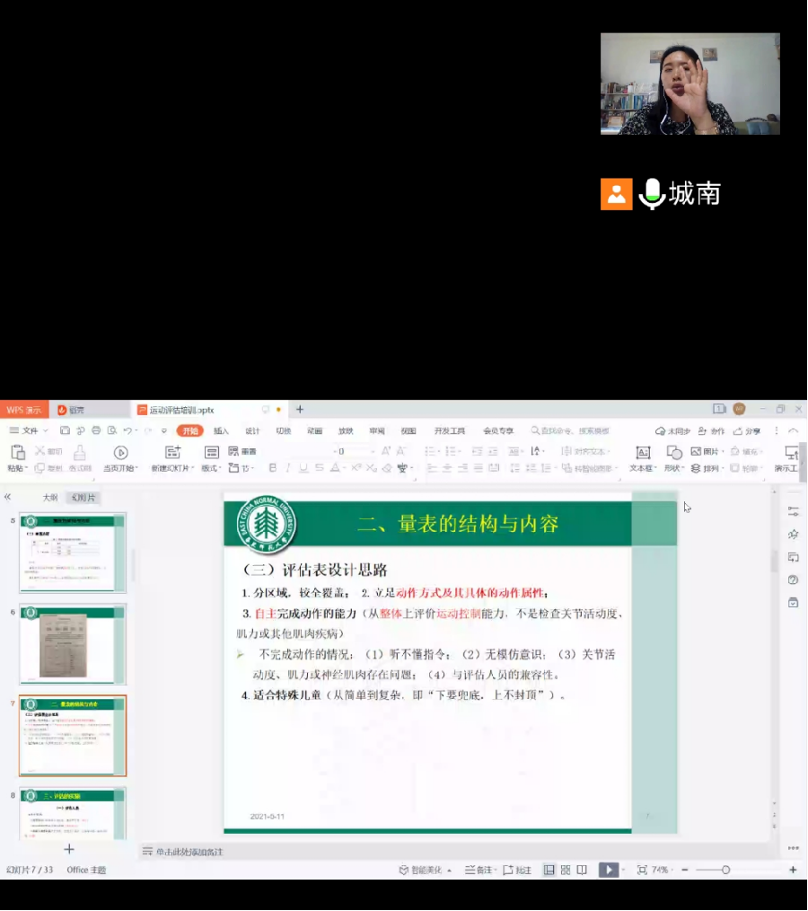 下午14点的讲座主题为“特殊儿童运动能力评估”,邀请到盲聋哑学校的孟庆燕老师通过线上演示的方式进行。本次讲座分为理论和实操两个环节。首先,孟老师从评估目的与功能定位、结构与内容、评估实施、计分标准与操作说明、结果分析五个方面进行讲述,并提到进行操作时,对基本动作、动作精细度、动作协调性要做到:①规范性、自然及系列动作的完整性;②儿童对动作速度、动作幅度及其整合(慢、大-快、小)的控制程度;③动作的同时性和继时性整合、动作转换的流畅性。其次是运动能力评估视频分享环节:结合视频的观看,同学们与孟庆燕老师进行了线上交流,对理论知识有了更加深入的理解。录像也是直接测评法中的一种方法,不仅可以提高评估效率,也可以重复使用。孟庆燕老师的视频分享提高同学们的兴趣,更重要的是加深同学们对运动能力评估的理解和记忆。