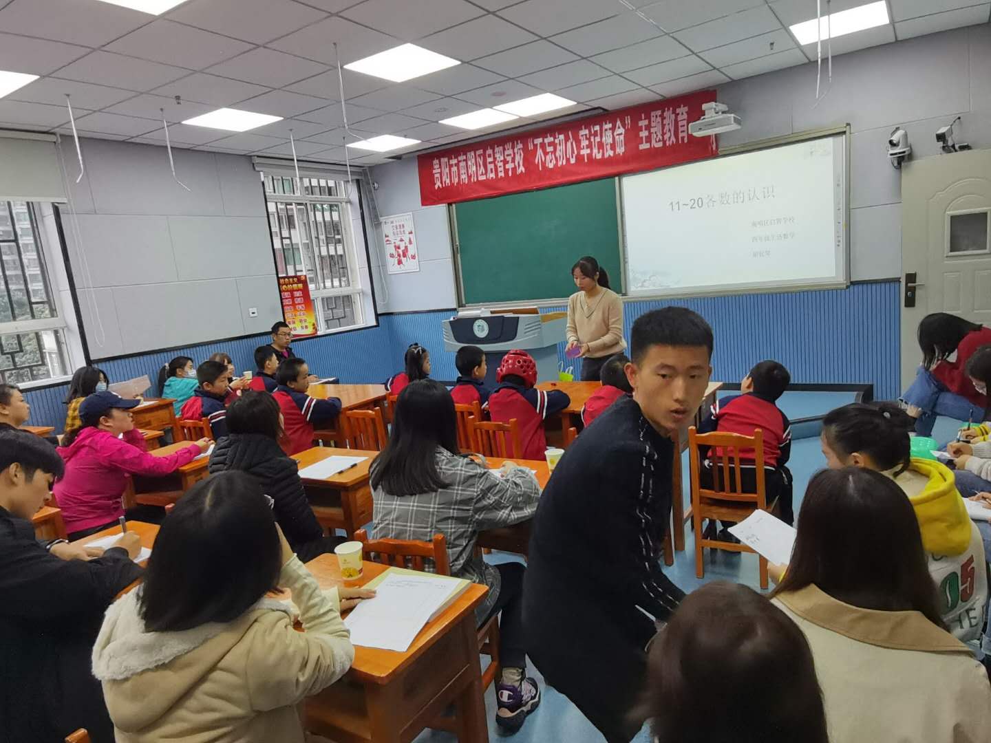 10月14日上午,贵州师范学院特教系2017级特殊教育专业教育实习前期检查暨基地校教学研讨活动于南明区启智学校开展。参与本次活动的人员有:贵州师范学院特教系杨娟老师、雷经国老师,南明区启智学校周丹副校长、教导主任和相关学科的教研室主任,在南明区启智学校实习的2017级特殊教育专业学生以及2018级特殊教育专业部分学生参与了本次基地校的教研活动和见习观摩。