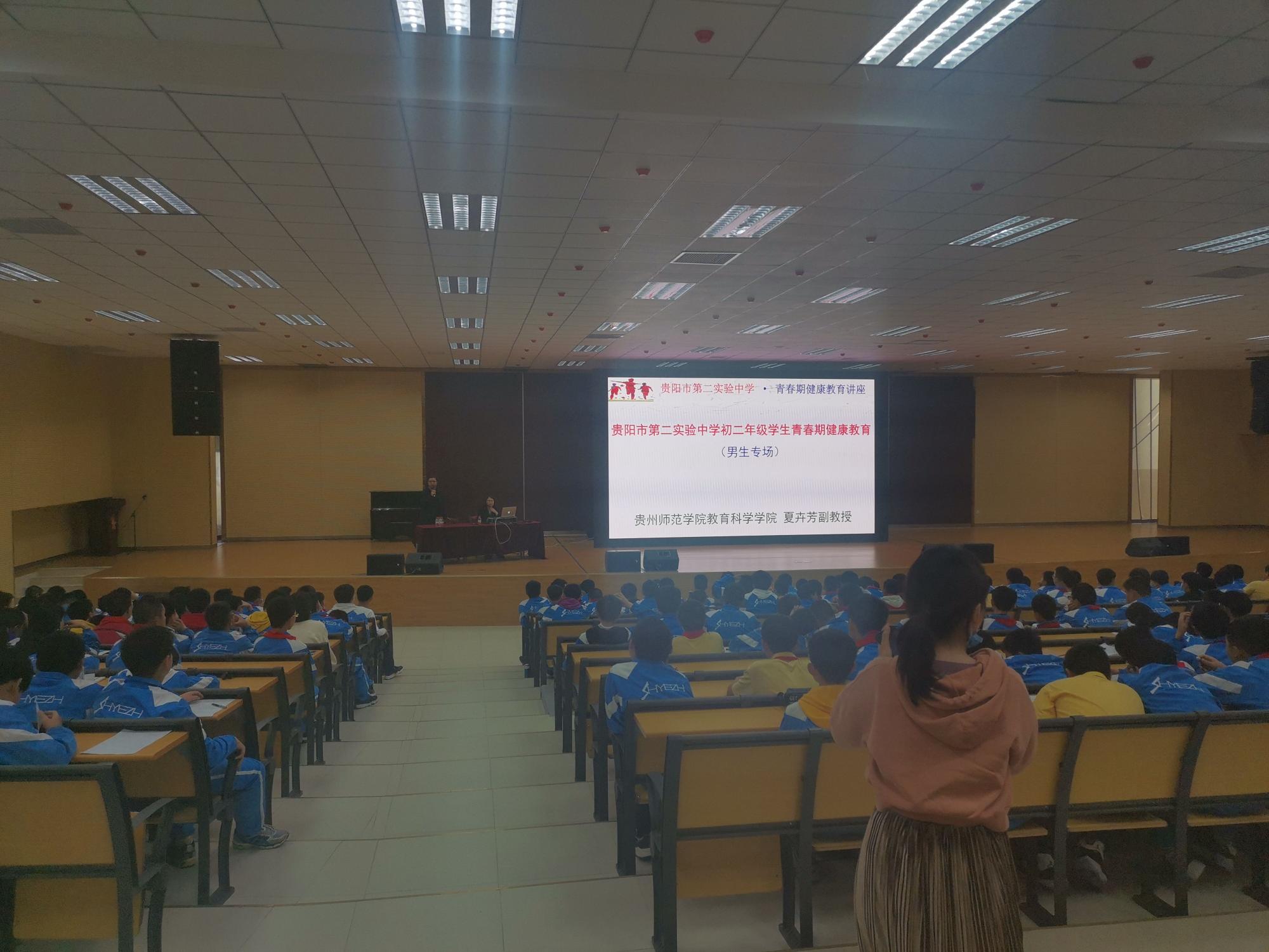 2020年11月20日下午,教育科学学院夏卉芳副教授受贵阳市第二实验中学邀请开展以青春期健康教育”为主题的讲座,讲座分为男生专场和女生专场,培训学生近千人(998名学生)。