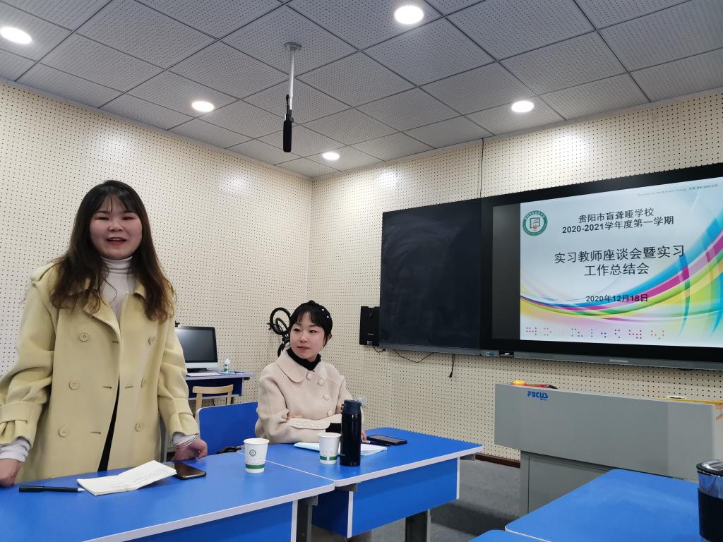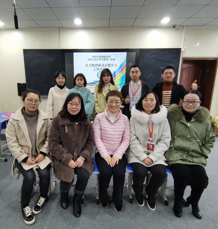 为期108天的贵阳市盲聋哑学校实习工作接近尾声,为欢送贵州师范学院实习生和总结实习经验,2020-2021学年度第一学期实习教师座谈会暨实习工作总结会20201218下午2:00贵阳市盲聋哑学校录播教室如期举行。参加此次会议的有贵阳市盲聋哑学校副校长郭绪英、教务处负责人卢方博、教务员毛碧娅,贵州师范学院的实习指导教师吴晓英、杨娟、饶畅以及特殊教育专业的5名实习,会议由毛碧娅老师主持。