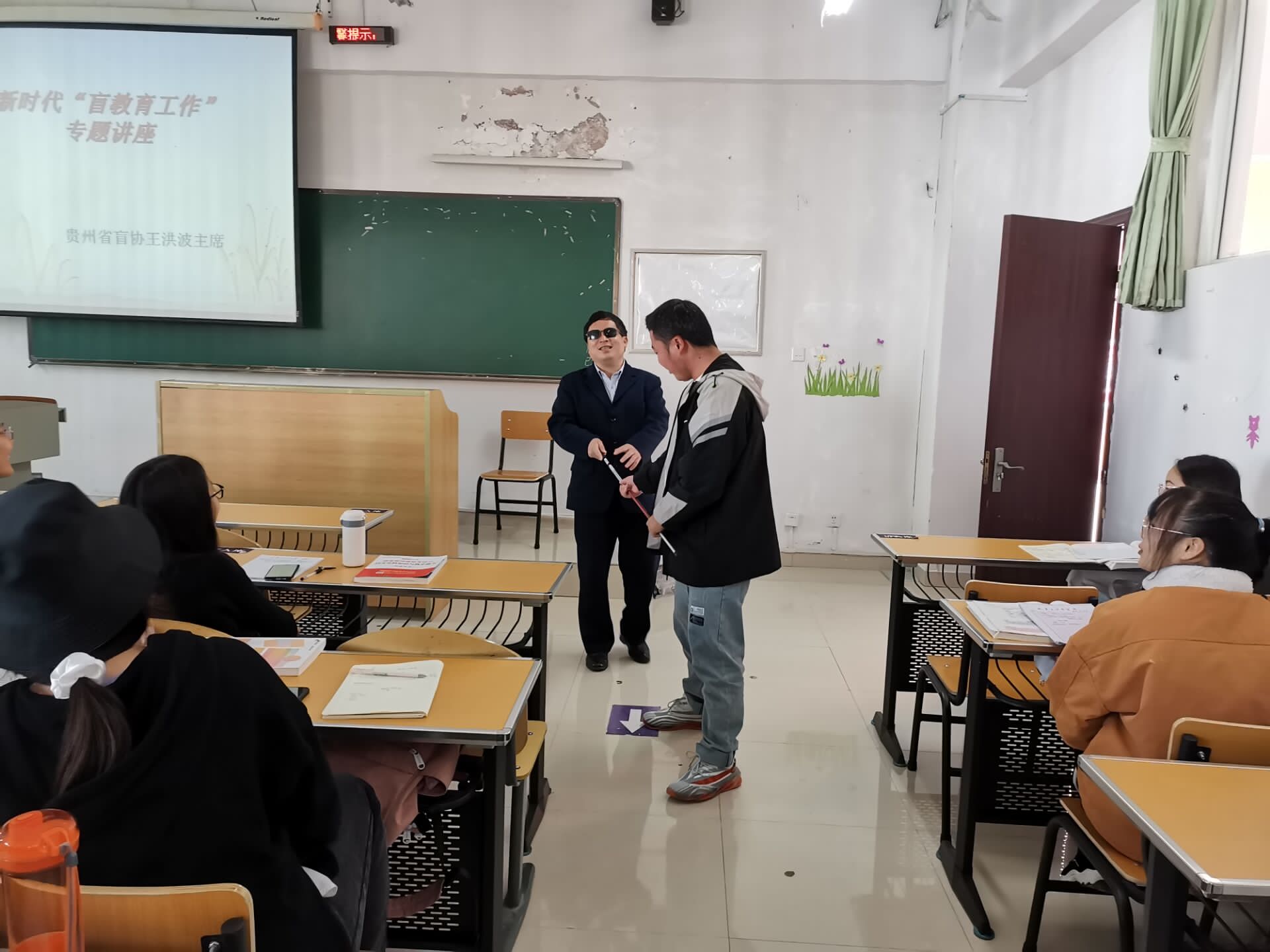 首先,王洪波给学生分享了自己的视力障碍领域相关教育工作的心得与收获。然后,从残疾的概念的内涵与分类入手,进而引发学生们的思考与积极回答,再向同学们介绍了生活中残疾人的鉴定、尤其是残疾证相关办理与认证工作情况,还有中国以及贵州的残疾人相关现实数据的统计情况,接着王洪波主席又向学生全面介绍盲人定向行走的技巧与方法,并与同学配合互动展示,其过程生动有趣、浅显易懂,得到了同学们的一致好评与欢迎。此外,王洪波还向学生们赠送了盲文书籍与盲杖等教学用具,加深同学们对视力障碍领域的理解与认识。