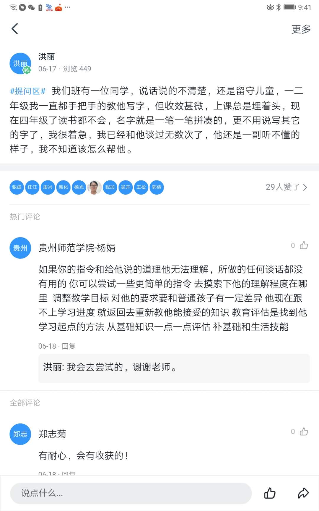 此次培训专家们分享了不同区域随班就读工作的实践、经验及问题,从政策规章、支持系统的建构、评估领域、目标差异、教学调整等多方面进行讲解。参与培训的教师获得了较为系统的随班就读知识。培训过程中,丰富多彩的课堂内容吸引了学员的注意,来自实践的案例引发了大家的共鸣和思考。授课结束后,学员们在群组学习圈里认真讨论,分享经验。